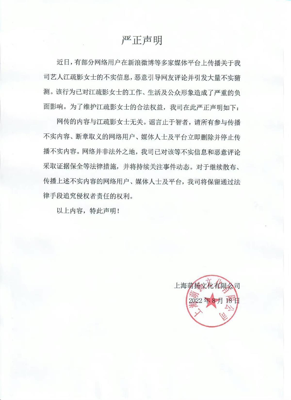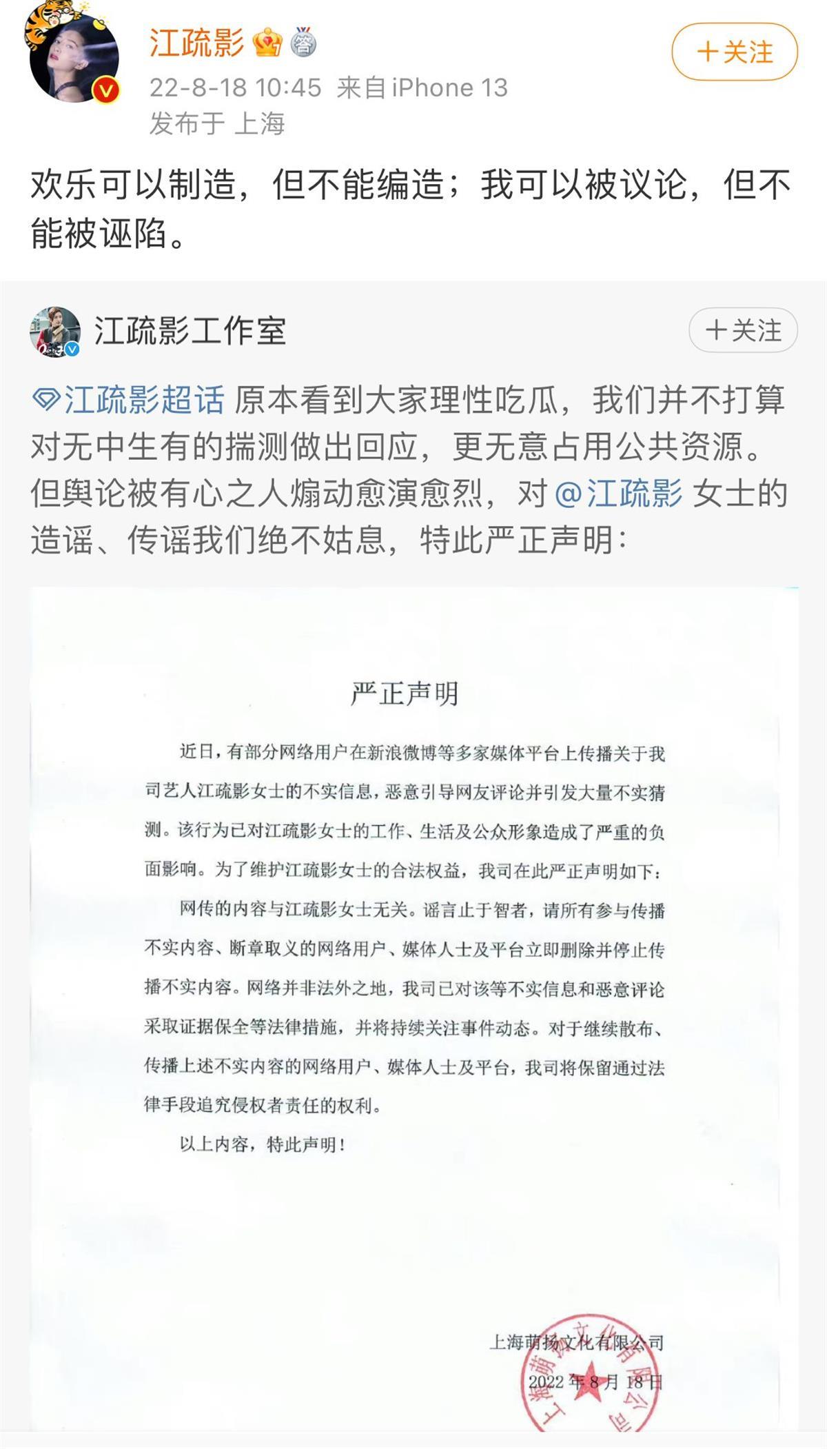 同时,江疏影工作室也发出严正声明,表示“原本看到大家理性吃瓜,我们并不打算对无中生有的揣测做出回应,更无意占用公共资源,但舆论被有心之人煽动愈演愈烈”。