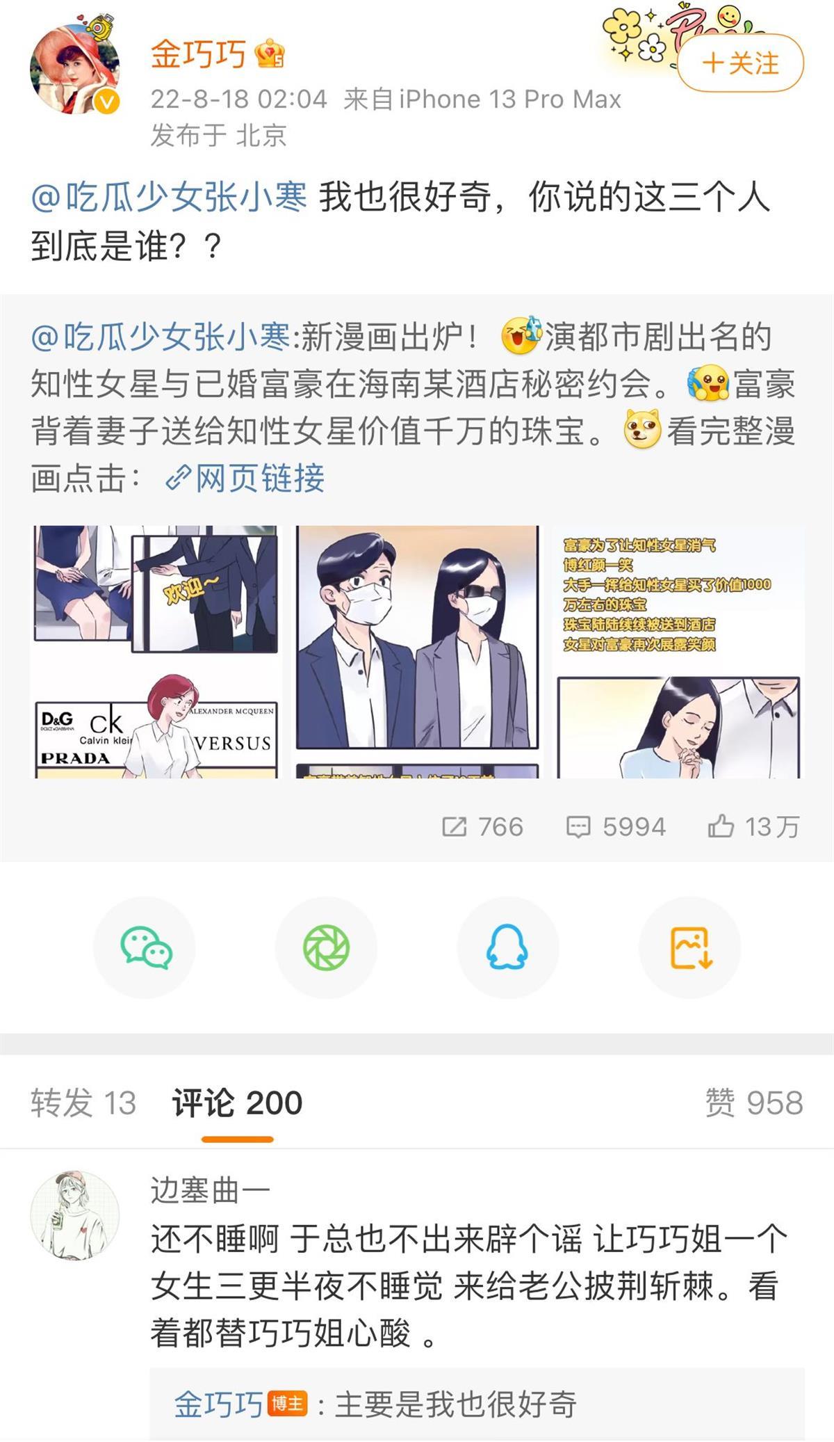 极目新闻记者注意到,就在江疏影发声澄清前,8月18日凌晨2点,仍在“网络冲浪”的金巧巧还转发“吃瓜少女张小寒”那条漫画微博,“我也很好奇,你说的这三个人到底是谁??”