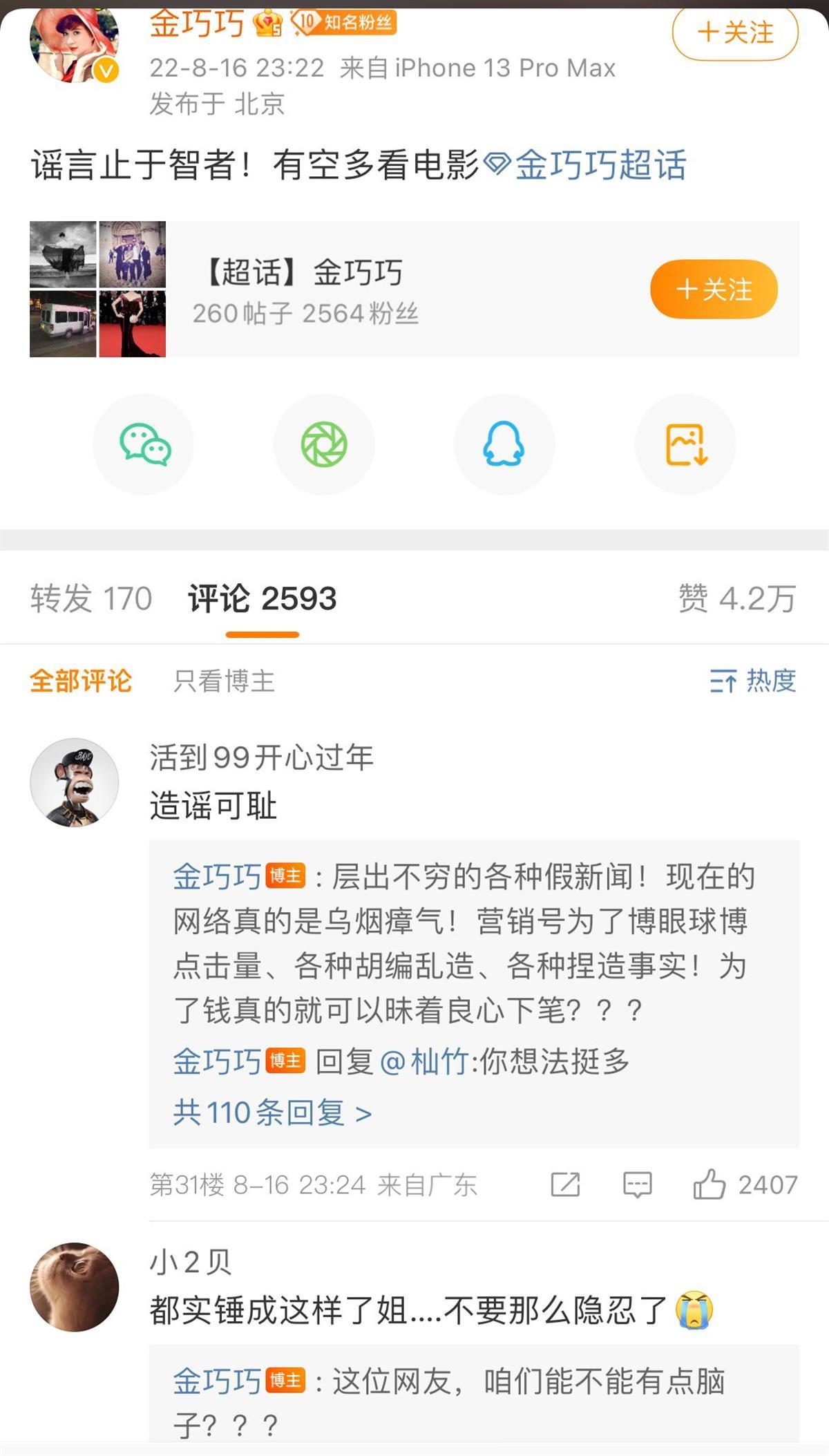 16日晚23:22分,于冬妻子、影星金巧巧在微博回应,“谣言止于智者!有空多看电影。”而在这条微博的评论区,金巧巧持续发言表示于冬与此事无关:“层出不穷的各种假新闻!现在的网络真的是乌烟瘴气!营销号为了博眼球博点击量,各种胡编乱造,各种捏造事实!”而当有网友在评论中提到“都实锤成这样了姐……不要那么隐忍了”时,金巧巧怒怼:“这位网友,咱们能不能有点脑子???”