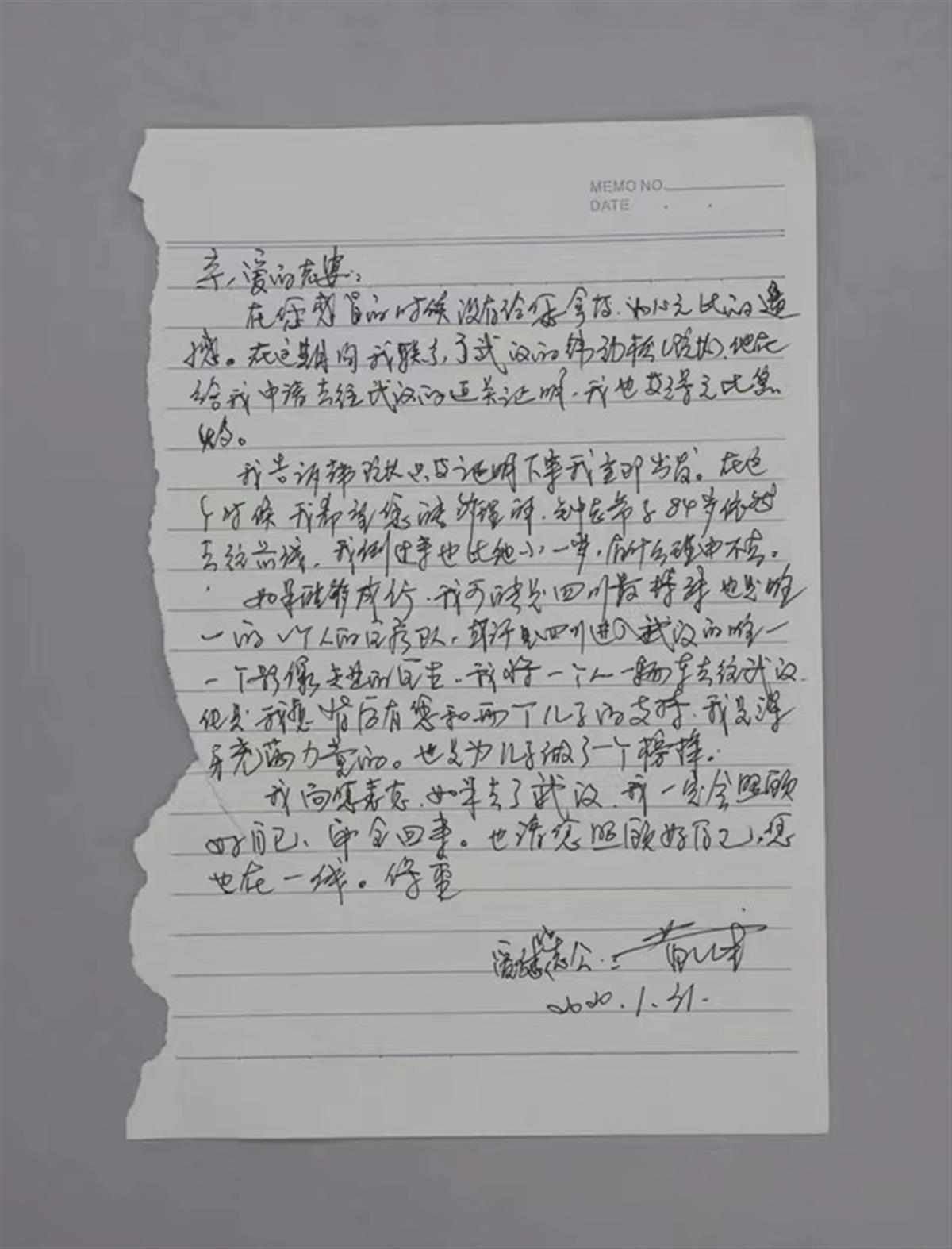 临出发前,黄维给妻子打电话,没有接听,他想了想,郑重地给妻子手写了一封家书,信中写道:“我可能是四川最特殊也是唯一的一个人的医疗队......我将一个人一辆车去往武汉,但是我想背后有你和两个儿子的支持,我是浑身充满力量的,也是为儿子做了一个榜样。钟老爷子(钟南山)84岁依然去了前线,有什么理由不去。”这封信,后来被武汉革命博物馆收藏了。