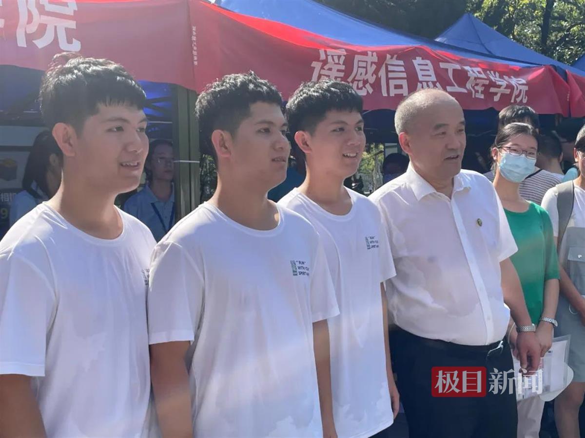 “武汉大学是最早报到的,我们一起来送大哥。”8月18日,武汉大学迎来2022级本科新生,在遥感信息工程学院的迎新点前,来自吉林省梅河口市的三胞胎兄弟林士博、林士翔和林士凯,被不少师生围观。武大校长窦贤康院士亲自和他们交流。