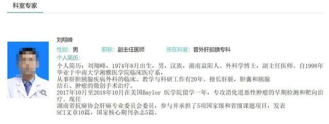 医院官网资料显示,刘翔峰出生于1974年8月,湖南益阳人,外科学博士,副主任医师。自1998年毕业于中南大学湘雅医学院临床医疗系,从事肝胆胰腺疾病外科的临床、教学与科研工作有20年。擅长肝脏、胆囊、胰腺结石和肿瘤的微创手术治疗。2017年10月至2018年10月在美国Baylor医学院留学一年,专攻消化道恶性肿瘤的早期检测和靶向治疗。现任湖南省抗癌协会肝癌专业委员会委员,参与并承担了5项国家级和省级课题项目,发表SCI文章10篇,国家核心期刊杂志5篇。