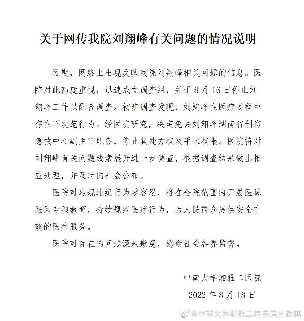 针对网传的刘翔峰医疗作风问题,8月18日,中南大学湘雅二医院发布情况说明称:初步调查发现,刘翔峰在医疗过程中存在不规范行为。经医院研究,决定免去刘翔峰湖南省创伤急救中心副主任职务,停止其处方权及手术权限。(据8月18日极目新闻)