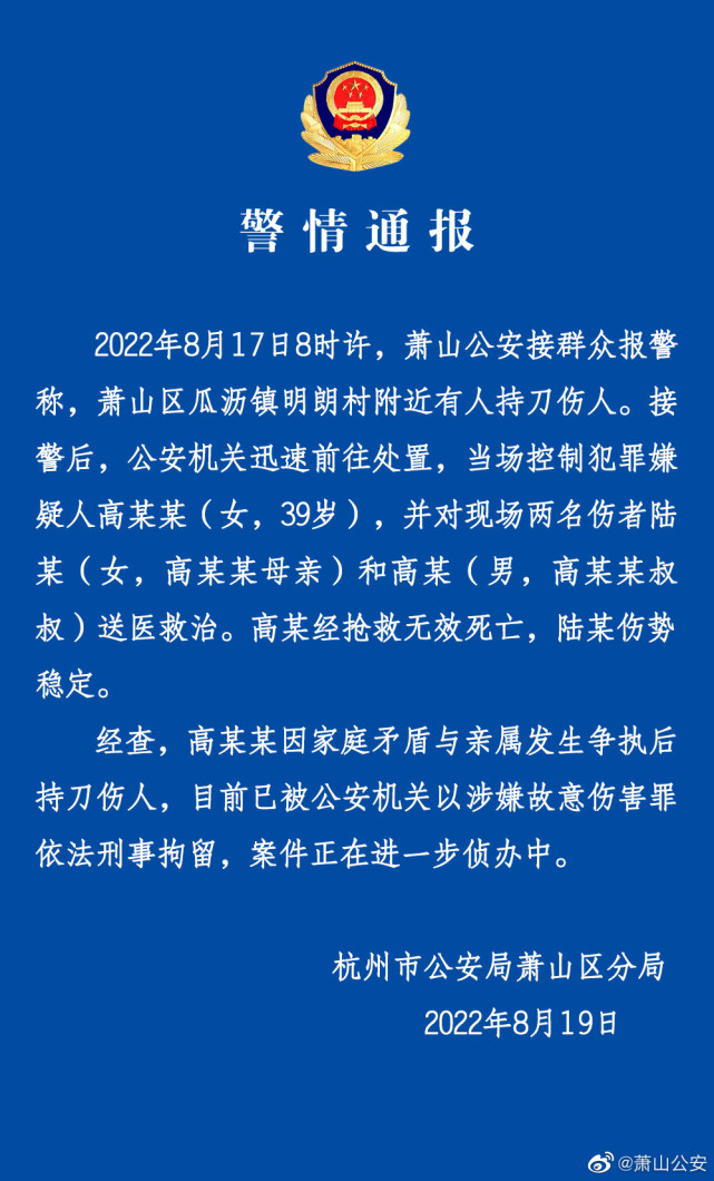 杭州市公安局萧山区分局(@萧山公安)通报:17日8时许,萧山公安接群众报警称,萧山区瓜沥镇明朗村附近有人持刀伤人。接警后,公安机关迅速前往处置,当场控制犯罪嫌疑人高某某(女,39岁),并对现场两名伤者陆某(女,高某某母亲)和高某(男,高某某叔叔)送医救治。高某经抢救无效死亡,陆某伤势稳定。经查,高某某因家庭矛盾与亲属发生争执后持刀伤人。