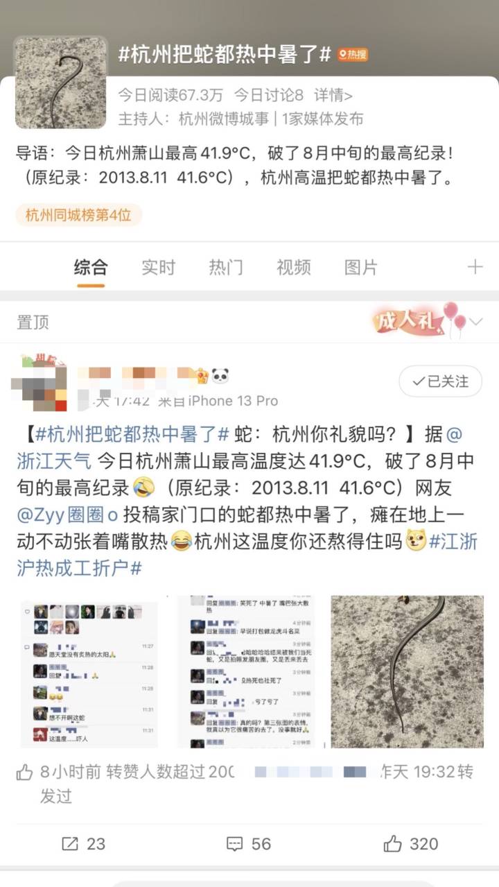 一条“杭州把蛇都热中暑了”的发帖冲上了本地热搜。