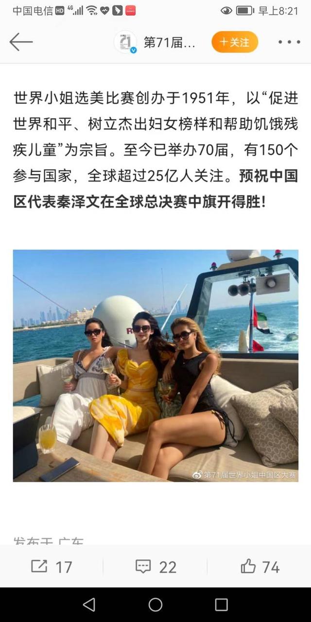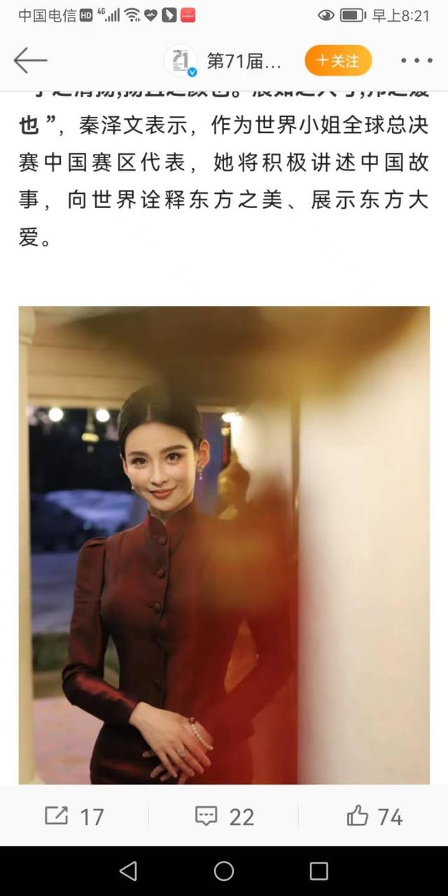 昨晚,秦泽文本人也在朋友圈回应了此事,她表示:“谢谢大伙儿的关心,是的,我比较任性为了儿时的梦想去逐梦了。”她还表示,世界小姐各国的冠军不乏年轻的女企业家、千亿慈善基金会的女主席、著名女记者、著名律师、作家、青年科学家。它是为女性发声的媒介,她会将金融行业女性的声音带去世界的舞台。