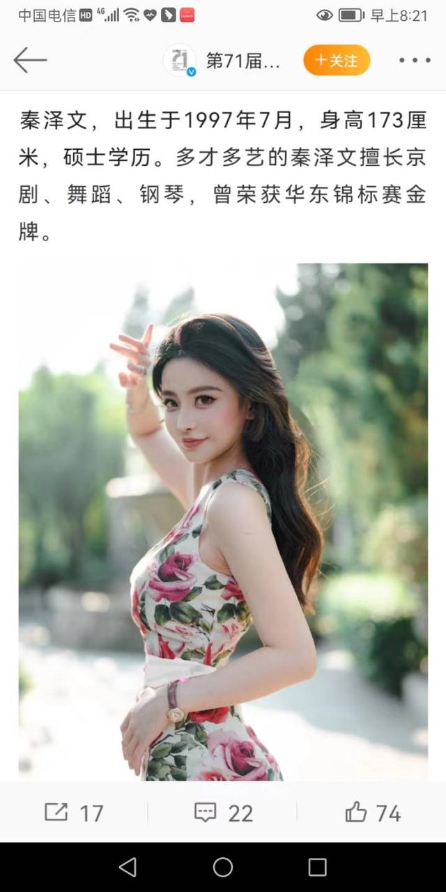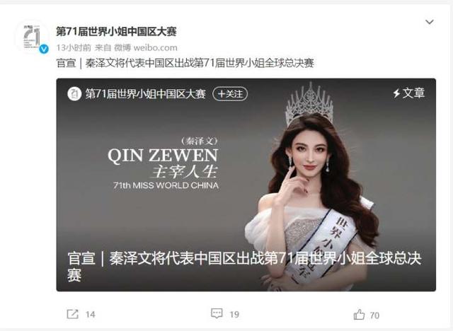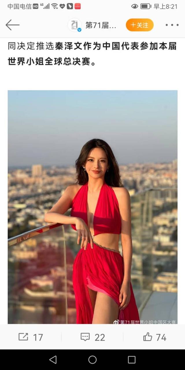 8月22日晚18时左右,第71届世界小姐中国区大赛在微博中官宣:“秦泽文将代表中国区出战第71届世界小姐全球总决赛。”该条微博还介绍,秦泽文出生于1997年7月,身高173厘米,硕士学历,擅长京剧、舞蹈、钢琴,曾荣获华东锦标赛金牌。