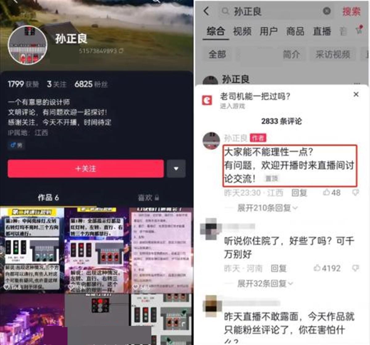 极目新闻记者注意到,此前一个名为“孙正良”的账号,在某视频平台开直播讲解科普了新版红绿灯规则,但开播仅10分钟,便因遭到网友质疑而下播。有网友称,该账号疑似新版红绿灯的设计者孙正良。