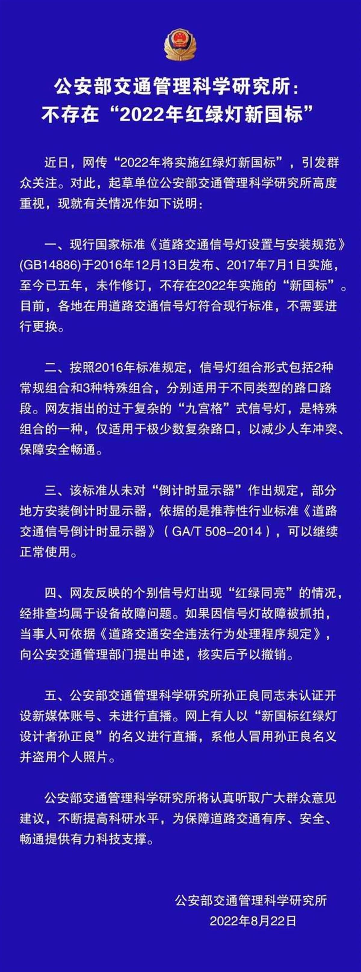 22日晚,公安部交通管理科学研究所发布情况说明称,不存在2022年实施的“新国标”,对上述网传消息进行了辟谣。同时,公安部交通管理科学研究所还表示,公安部交通管理科学研究所孙正良同志未认证开设新媒体账号、未进行直播。网上有人以“新国标红绿灯设计者孙正良”的名义进行直播,系他人冒用孙正良名义并盗用个人照片。
