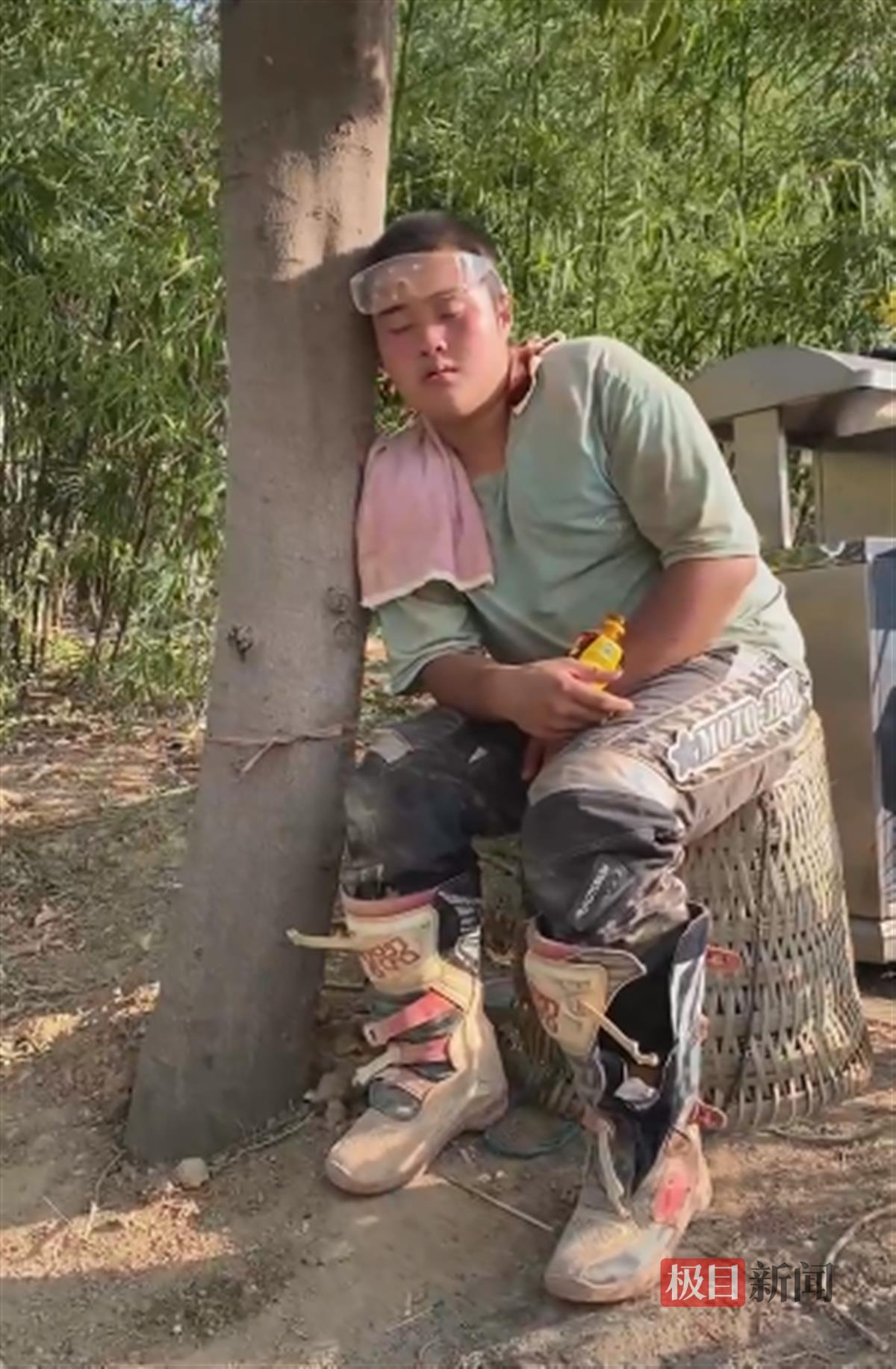 为了提神,“龙麻子”往头上浇水。实在累了,就趴在摩托车上休息片刻。困意袭来,背篓可以做凳,路边的树做枕,靠着就能睡着。虽然中途短暂回过一趟家,但连日在山间土路奔忙,让“龙麻子”的衣服沾满尘土,浅绿色的T恤都出现大片灰色。有人说他辛苦,他只说山里的灭火人员更辛苦。“火不灭,不回家。”“龙麻子”一次次坚定地说。
