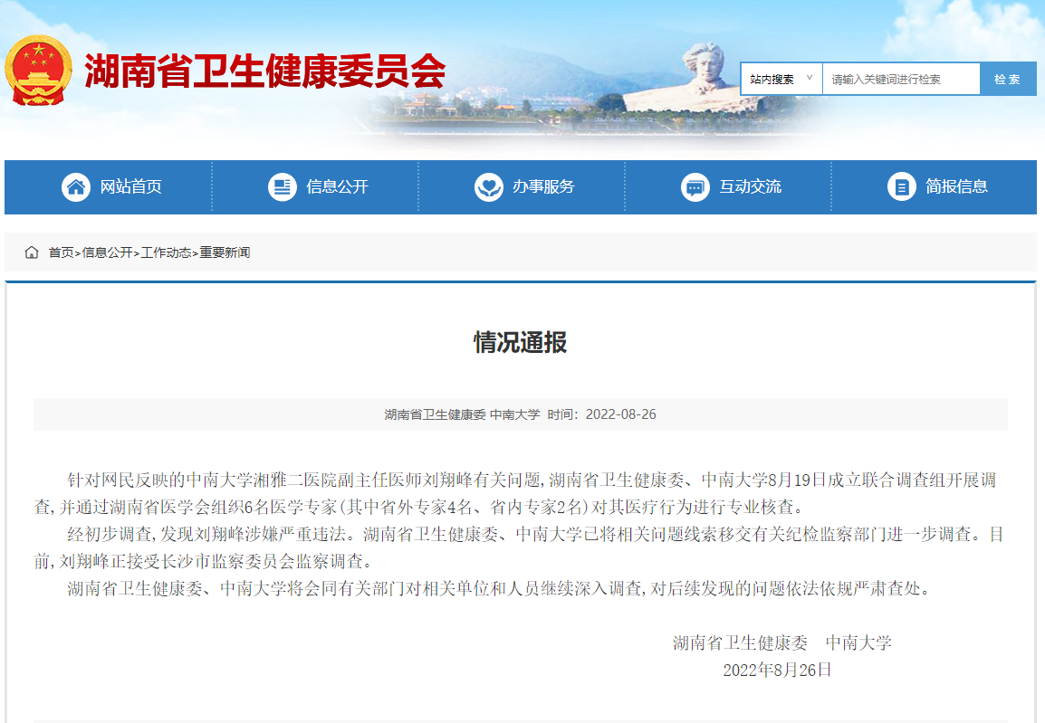 针对网民反映的中南大学湘雅二医院副主任医师刘翔峰有关问题,湖南省卫生健康委、中南大学8月19日成立联合调查组开展调查,并通过湖南省医学会组织6名医学专家(其中省外专家4名、省内专家2名)对其医疗行为进行专业核查。