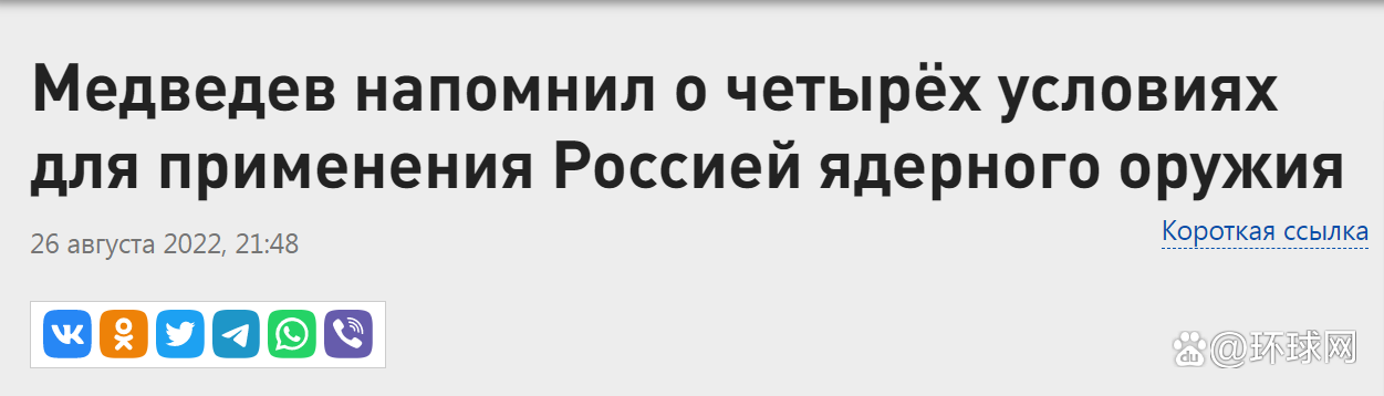 “如果我没记错的话,该文件第19条中列出了使用核武器的4种条件。既然大家感兴趣,我也向法国观众列出这些条件——(攻击俄罗斯和/或其盟国的)核导弹已经发射;对(俄罗斯和/或其盟国)使用核武器;对(俄罗斯)控制核武器的关键设施实施打击;以及其他威胁俄国家生存的行为。”梅德韦杰夫说,“目前(俄方)尚未看到此类行为出现”。