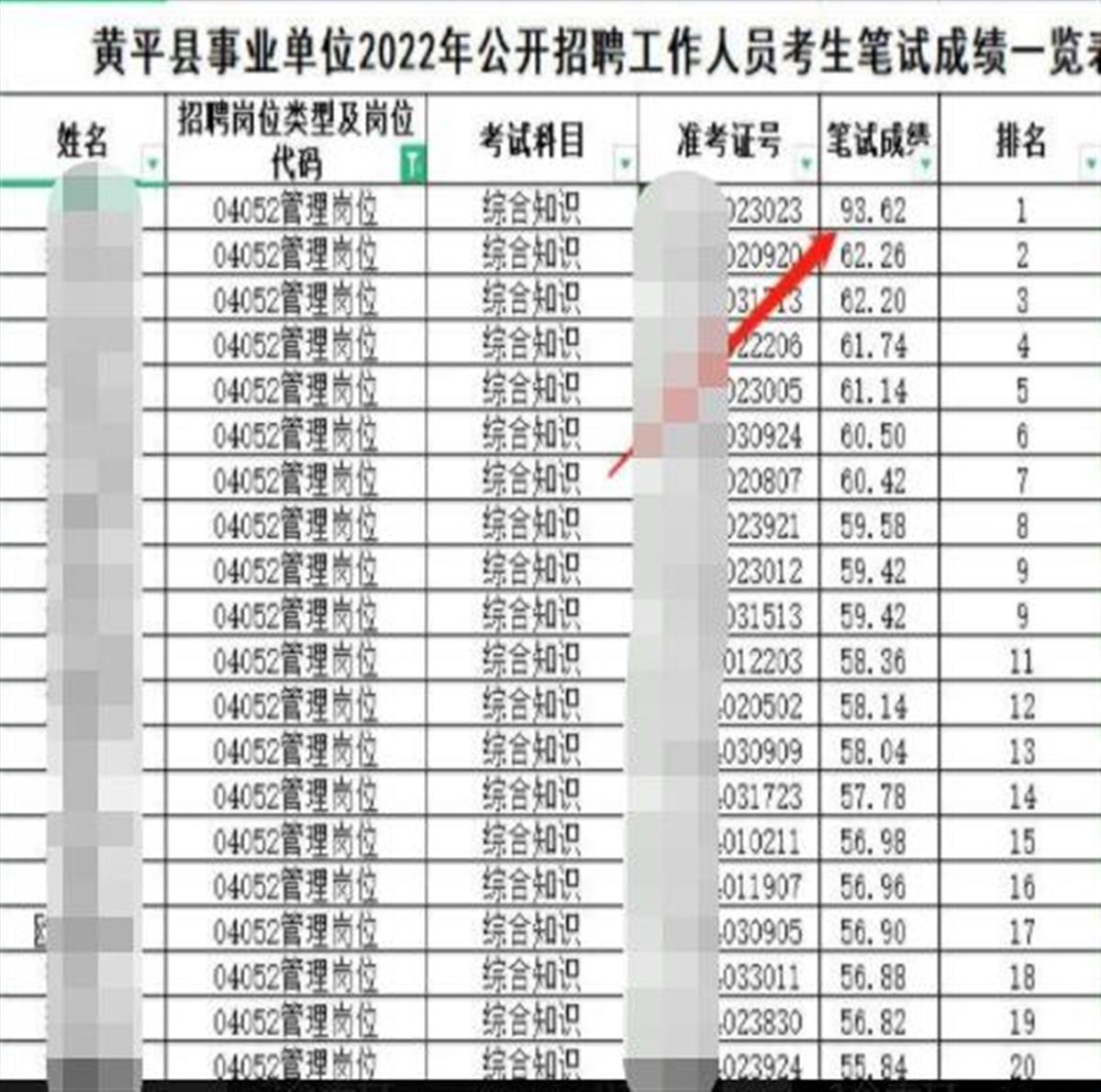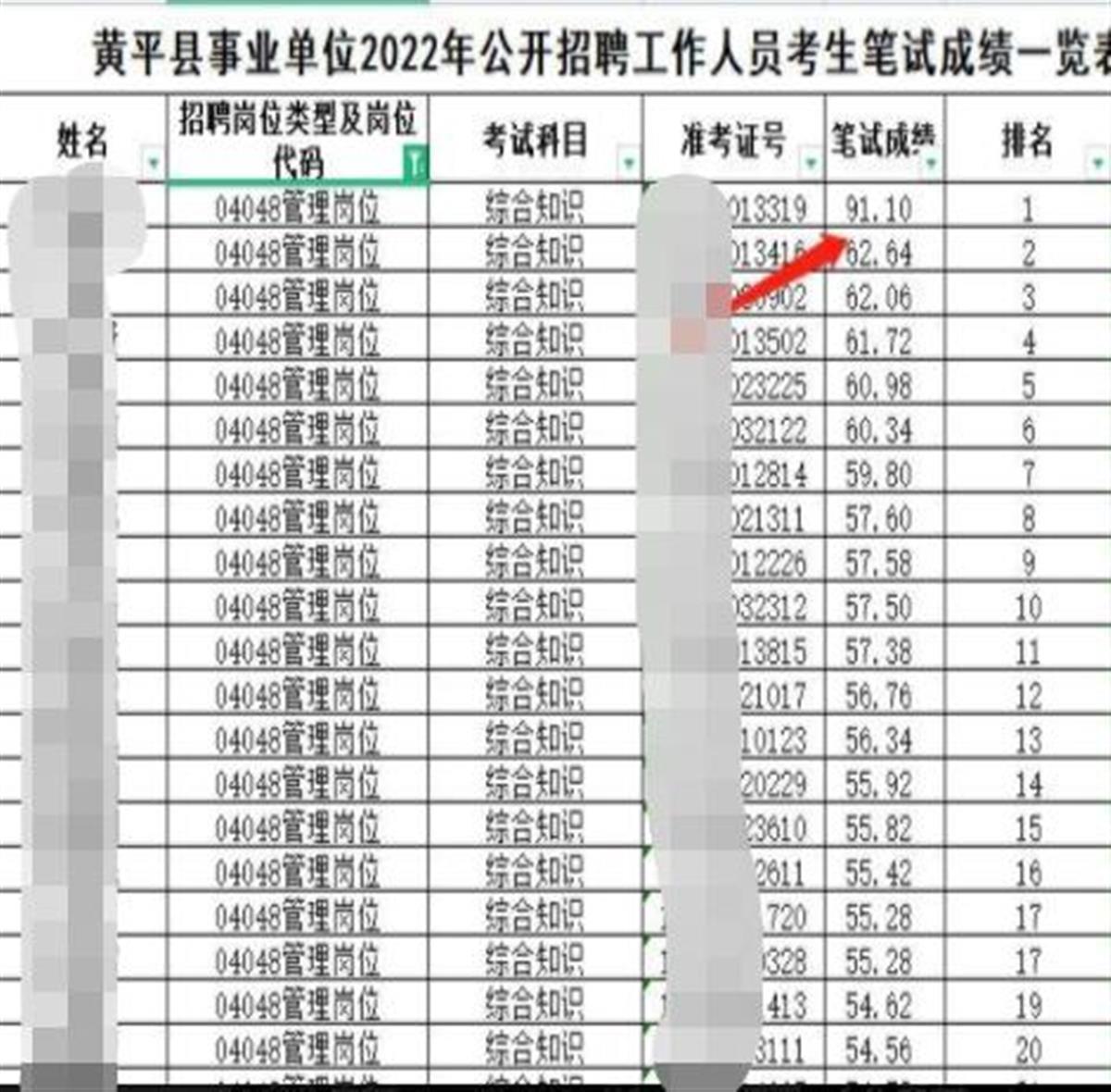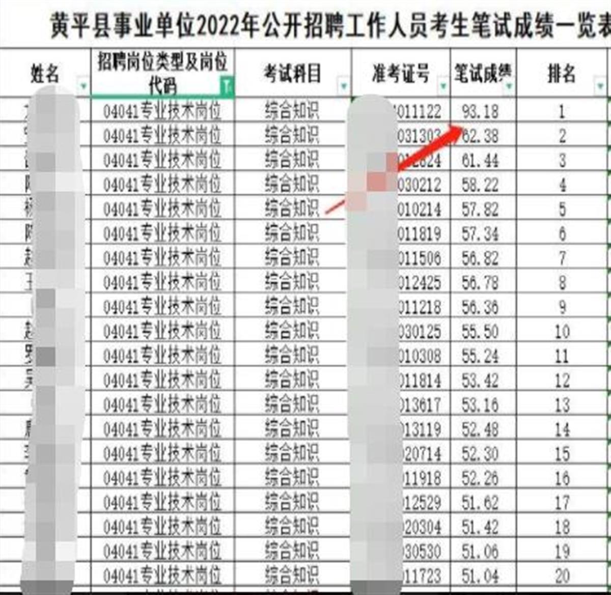 据此前当地公布的笔试成绩表显示,多为第一名90多分,第二名为60多分,相差30分左右。