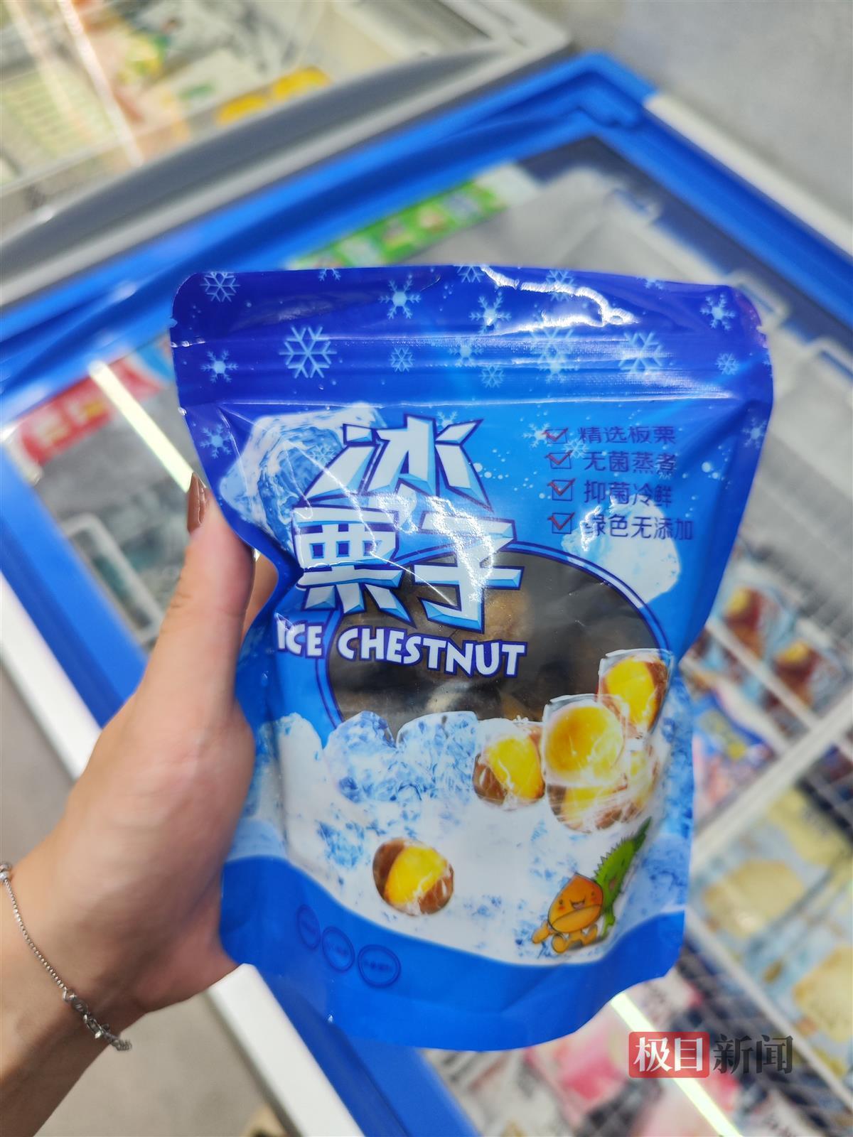 28日,极目新闻记者购买了一小袋冰冻板栗,约半斤,15元。因多为炒货店自制,记者并未找到生产日期和保质期等,外观看上去就是冻了的糖炒栗子。冰冻后,需要拿出来放上三五分钟,才比较好入口,若放上十分钟,口感和糖炒栗子就比较相似了。若不等待化冻,拿出来就咬,会硬邦邦的,不太咬得动,牙口不好的人不建议立即食用。