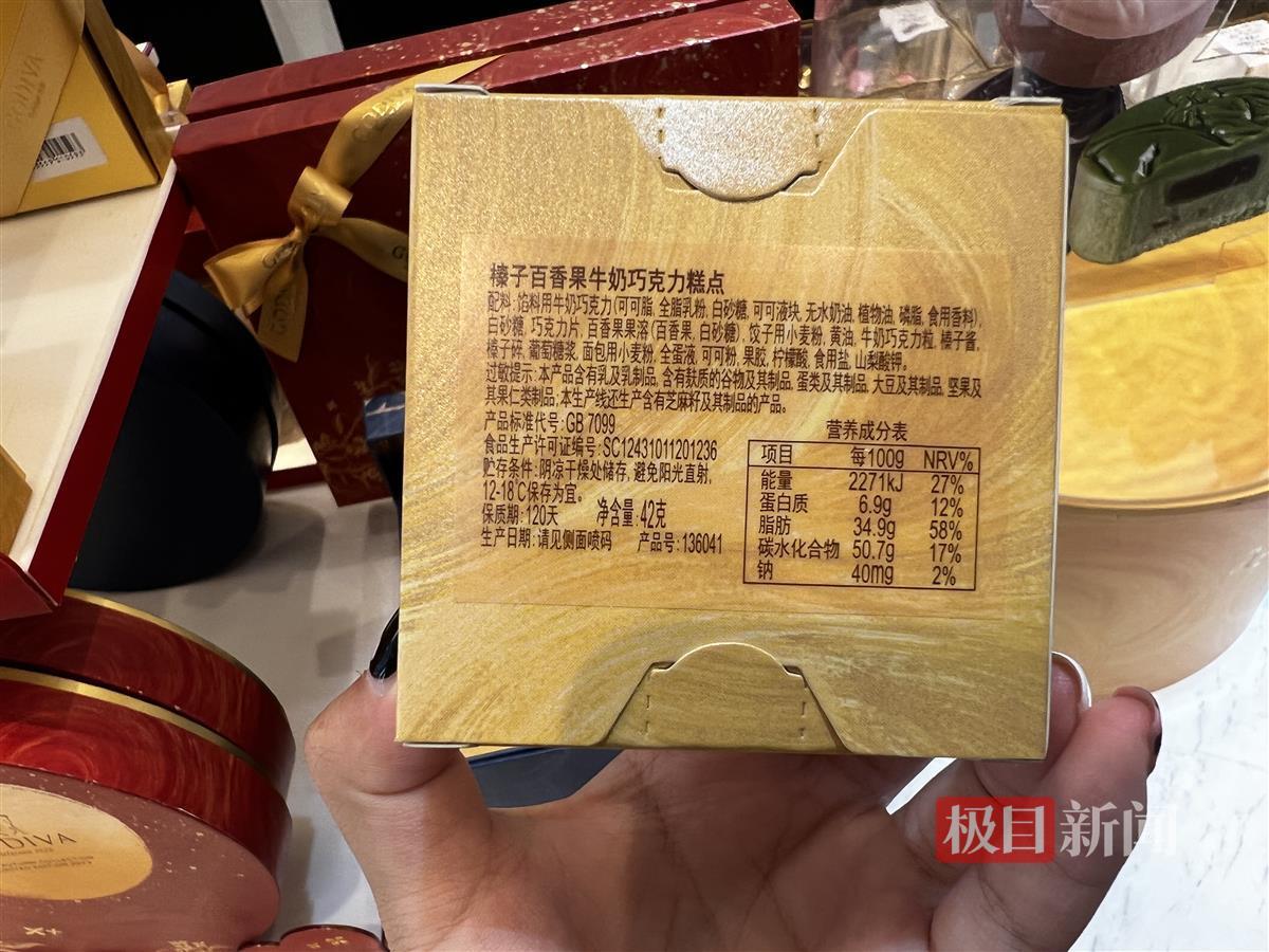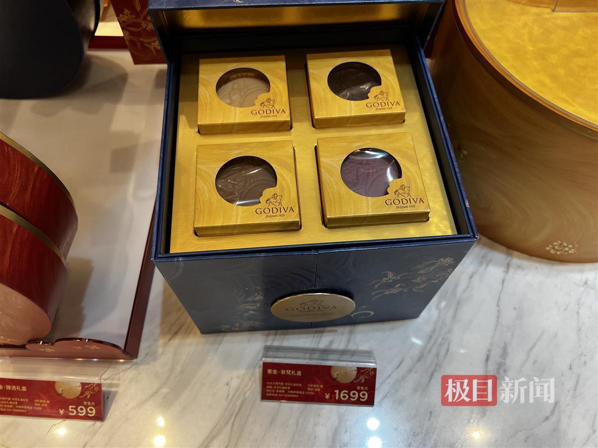 8月26日,极目新闻记者在武汉楚河汉街的歌帝梵门店看到,该系列中秋限定礼盒作为主打商品摆放在店内销售,分为多个规格,其中最贵的一款售价1699元,此外还有多款售价599元、739元、1499元。记者拿起其中一款礼盒中的食品看到,其外形为圆状糕点,中间有夹心馅料,和月饼十分相似,但包装盒上却写着“巧克力糕点”。
