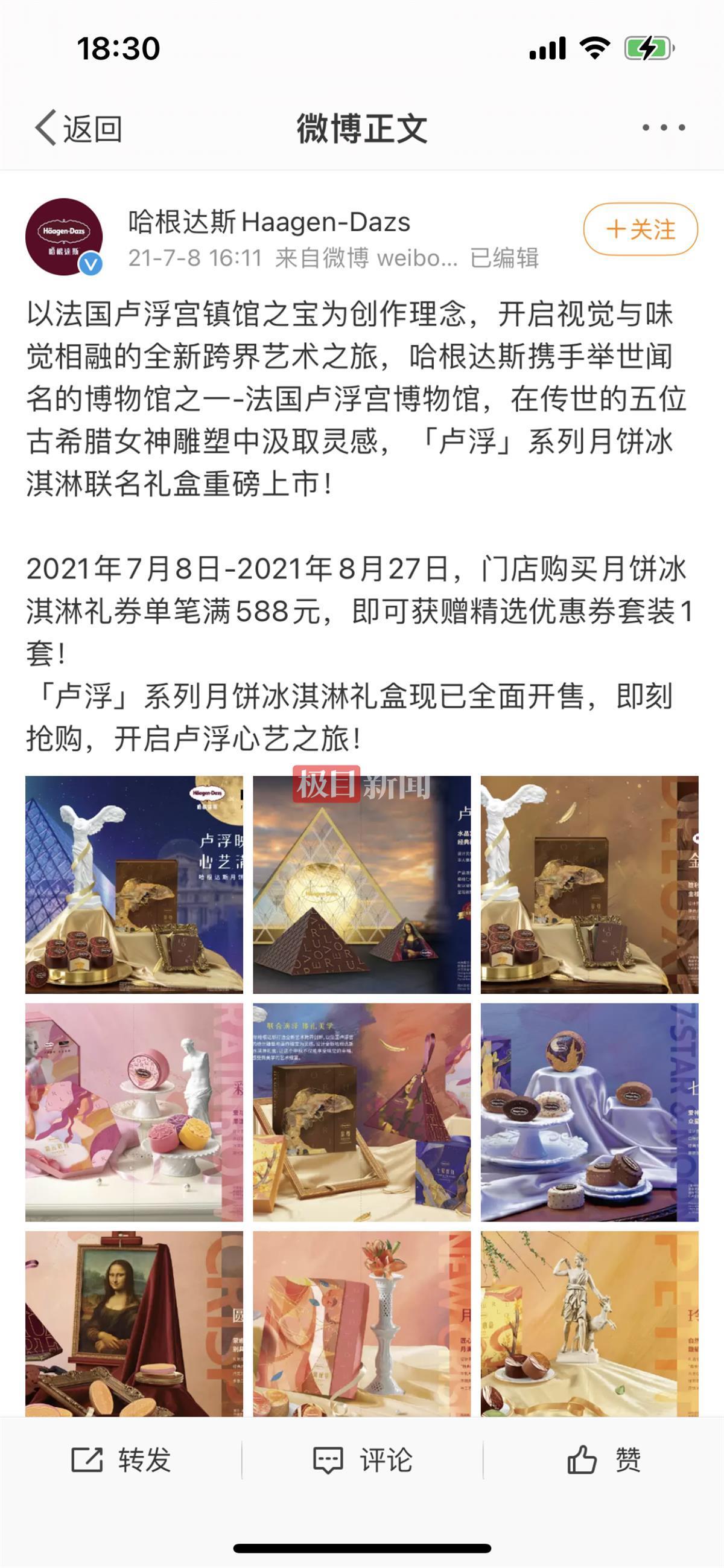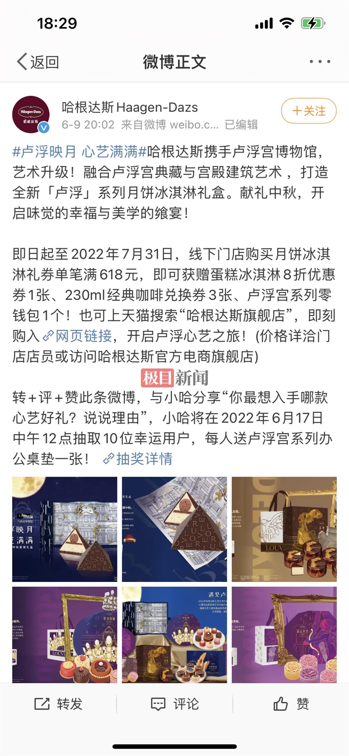 6月9日,哈根达斯官方微博发布产品宣传时还称其为“月饼冰淇淋礼盒”,此后的宣发中便改名为“金秋礼盒套装”。去年,哈根达斯也推出了该系列中秋礼盒,最贵的一款售价1188元,彼时官方均称其为“月饼冰淇淋联名礼盒”。