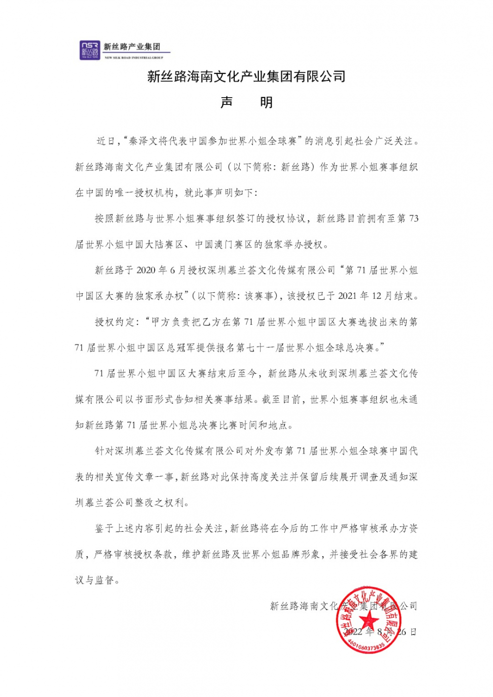 8月26日,新丝路海南文化产业集团有限公司(以下简称“新丝路”)发布声明称,他们是世界小姐赛事组织在中国的唯一授权机构。而此前宣布秦泽文参加“世姐”总决赛的慕兰荟文化传媒有限公司(以下简称“慕兰荟”)只是被授予了独家承办权,并且该授权早在2021年12月就已结束。