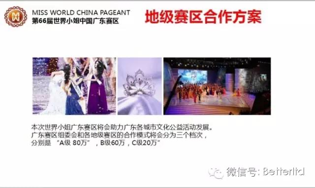 红星资本局翻阅更好文化的微信公众号发现,其在2016年5月11日发布了一则“第66届世界小姐广东赛区合作方案”,其中就提到,世界小姐广东赛区组委会和各地级赛区的合作模式将会分为三个档次,分别是A级合作80万元,B级合作60万元,C级合作20万元。不同档次,授权方的权益也不同,还明码标价决赛单一冠名的赞助费用高达200万元,伙伴赞助商的费用也要80万元。