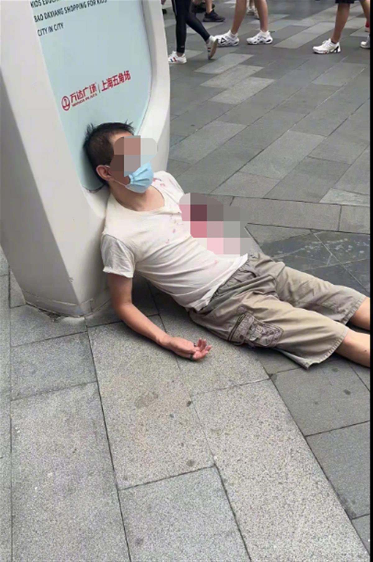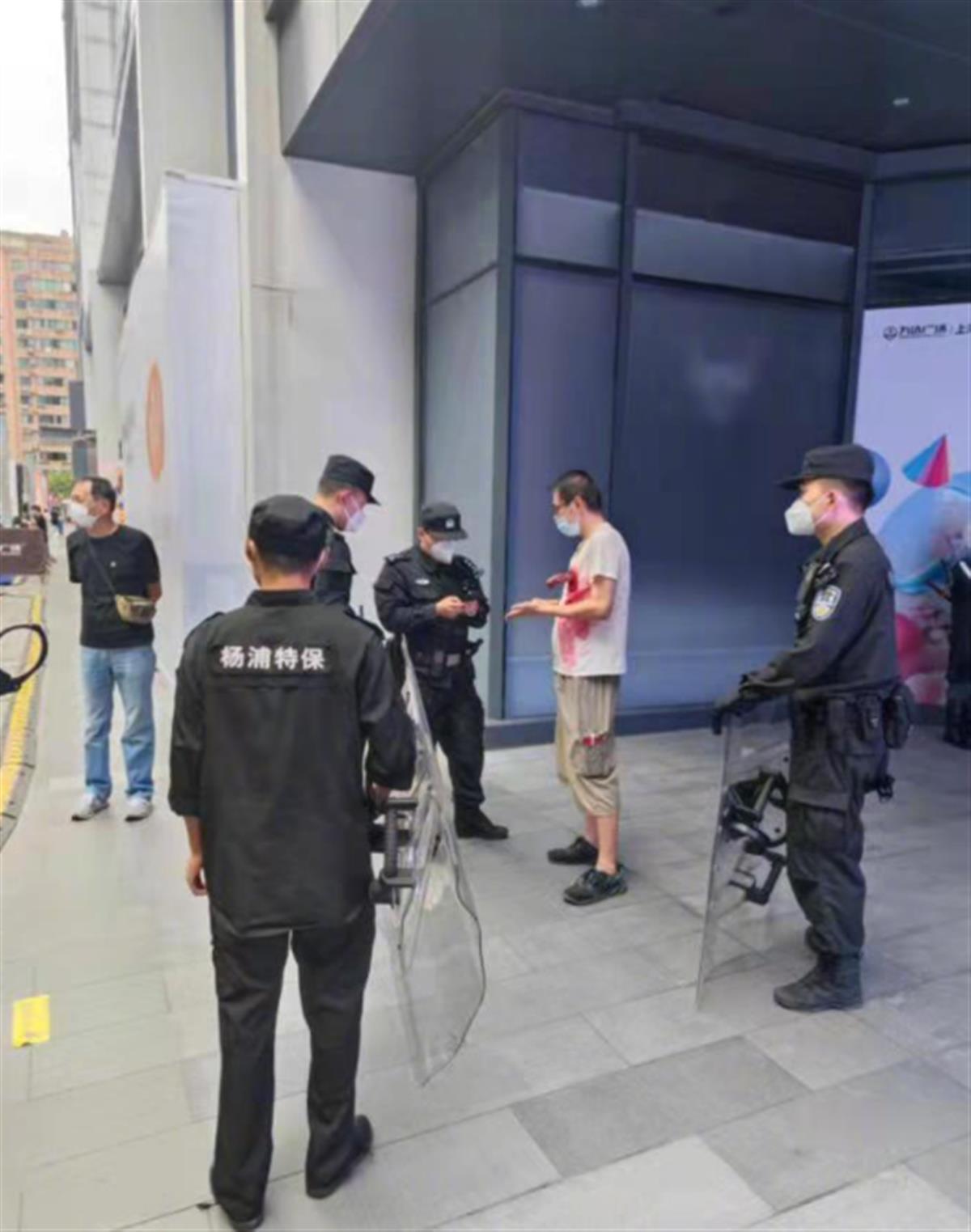 网传图片显示,一名戴着黑框眼镜的男子坐躺在一块广场指示牌旁,其上衣胸口位置插着一把“利器”,衣服上还有大面积红色印迹。而另一张图片中,上述疑似“被捅”的男子竟“奇迹”般站了起来,正接受几名工作人员询问。极目新闻记者注意到,上述图片中指示牌显示,事发地点为上海市杨浦区某商业广场附近。