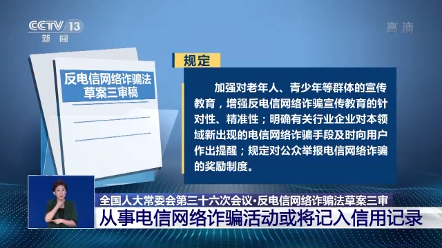 全国人大常委会第三十六次会议今天召开,反电信网络诈骗法草案三审稿提请全国人大常委会审议。草案三审稿规定,对从事电信网络诈骗活动的有关人员,可以按照国家有关规定记入信用记录,并规定了具体惩戒措施。同时,明确有关部门应当建立健全申诉渠道、信用修复和救济制度。