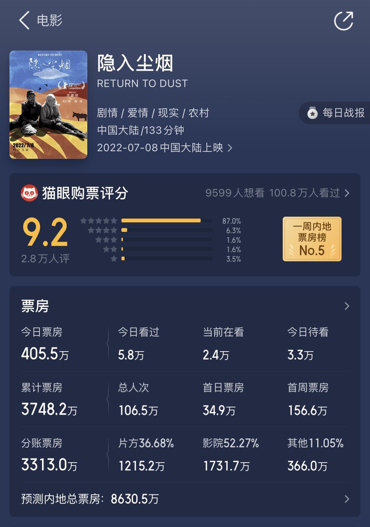 第三方数据统计显示,从8月26日起,《隐入尘烟》的票房突然出现了飞跃式增长,尤其是8月30日当天,单日票房突破400万大关,成为该片上映以来单日最高票房,而其电影总票房也达到了3700万。根据大数据预测,按照该片目前的排片趋势,《隐入尘烟》的最终总票房有望达到8000万,成为李睿珺导演最卖座作品。