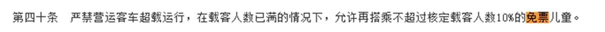 《道路旅客运输及客运站管理规定》中,是否真的有上述条款?极目新闻记者查阅发现,在上述规定的第四十条提到,严禁营运客车超载运行,在载客人数已满的情况下,允许再搭乘不超过核定载客人数10%的免票儿童。