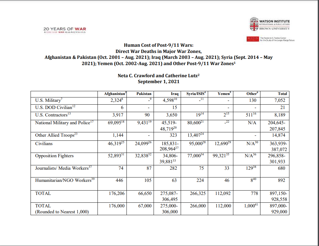 阿富汗战争中超过17.6万人死亡据布朗大学沃森国际和公共事务研究中心统计,阿富汗战争期间直接死亡人数超17.6万人,其中阿富汗平民超过46000多人死亡。美国方面,2300多名美军士兵死亡,超过2万名士兵负伤。