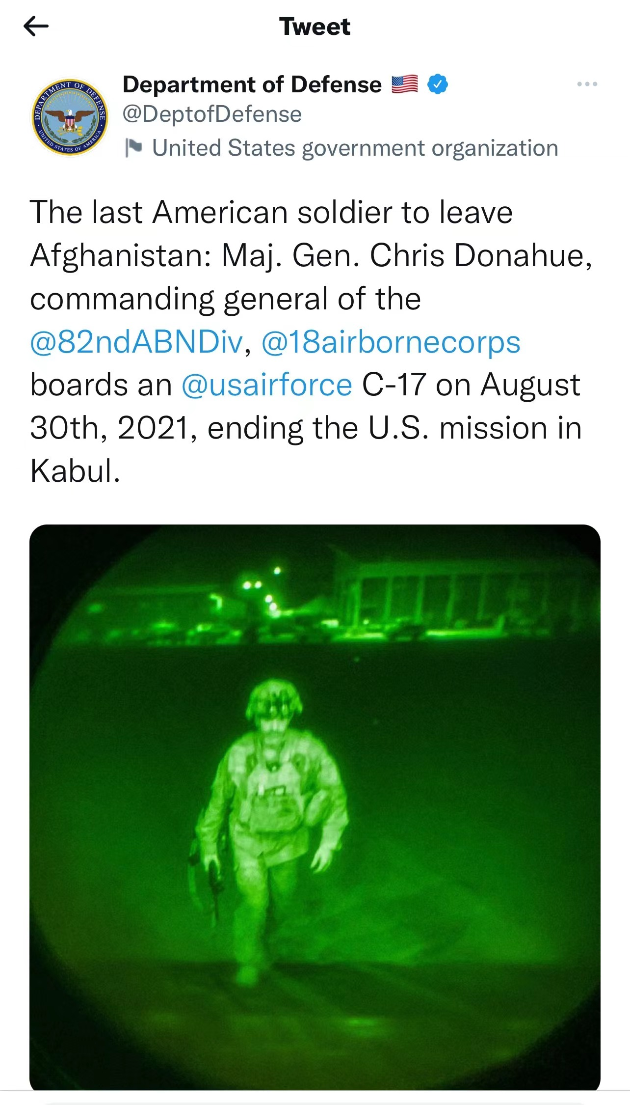 美国国防部于2021年8月30日在社交媒体上发布了最后一名美军士兵离开阿富汗的照片。在夜视仪的画面中,美军第82空降师指挥官克里斯·多纳休在喀布尔机场登上了一架C-17运输机。美国中央司令部司令麦肯齐透露,多纳休与美国驻阿富汗首席外交官罗斯·威尔逊是最后两名离开阿富汗的美国官员,最后一架撤离阿富汗的美国军机上主要乘载的是美国政府和国防部工作人员。在照明弹的白光照射下,飞机不断爬升,消失在夜幕中。美联社描述道,阿富汗塔利班人员目送最后一架美国飞机消失在阿富汗上空,随后朝天鸣枪进行庆祝。