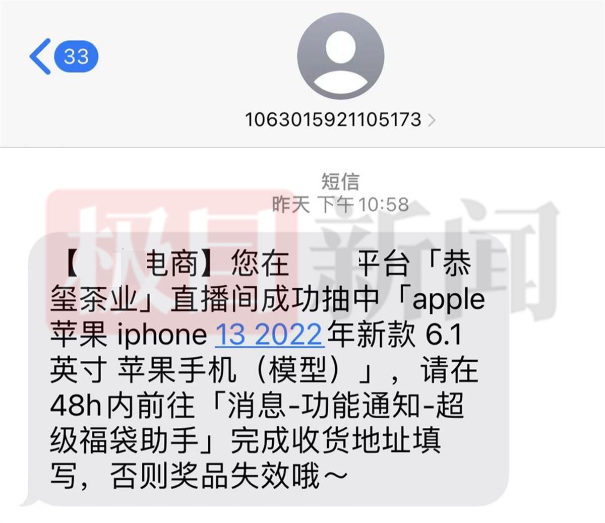几分钟后,万女士收到中奖信息显示:“您在直播平台成功抽中apple苹果iPhone13 2022年新款6.1英寸苹果手机(模型)。”但此前商家宣传页面都显示的是苹果13手机,还明确标注了价值5899元。