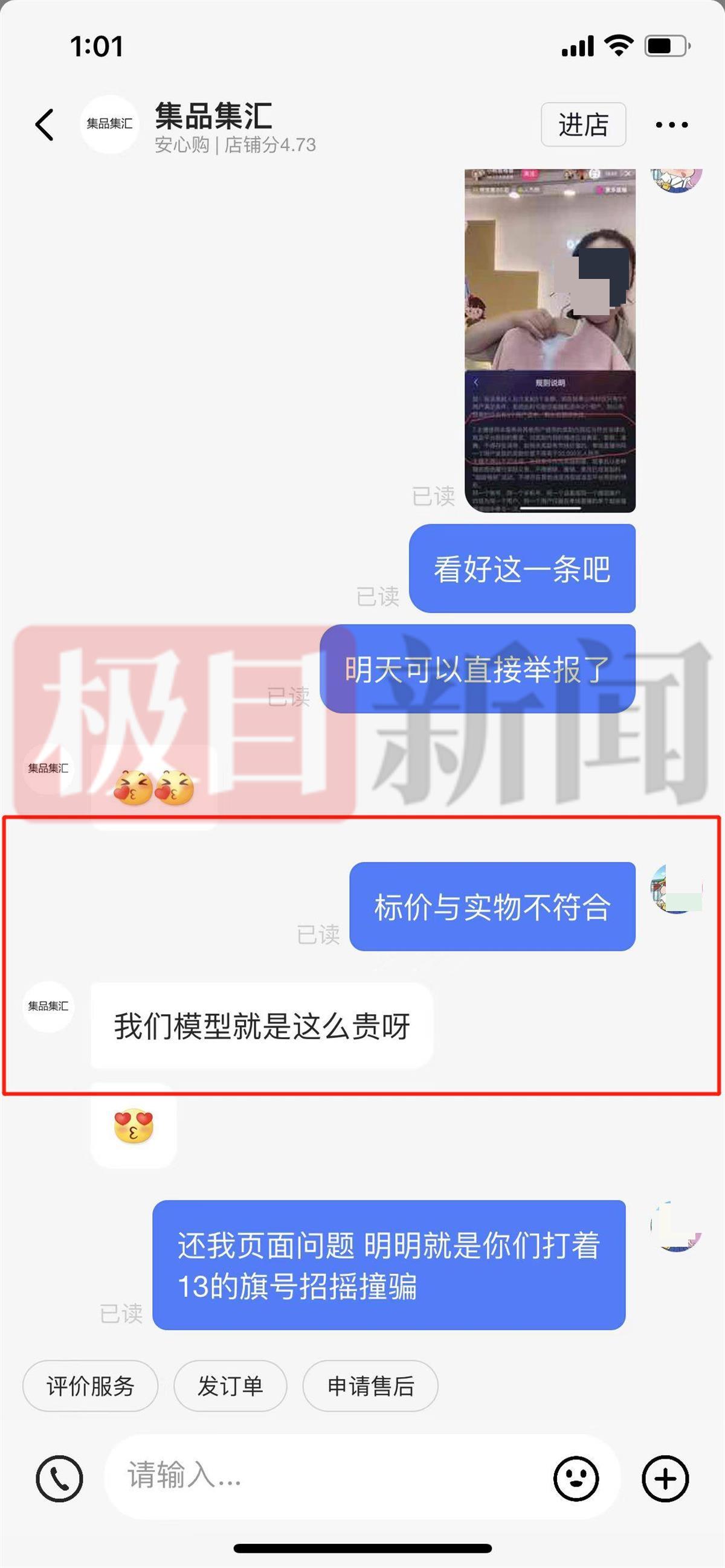 万女士发给记者的聊天截图显示,她跟客服沟通并质疑店面标价和实物不符时,客服回复称:“我们模型就是这么贵。”