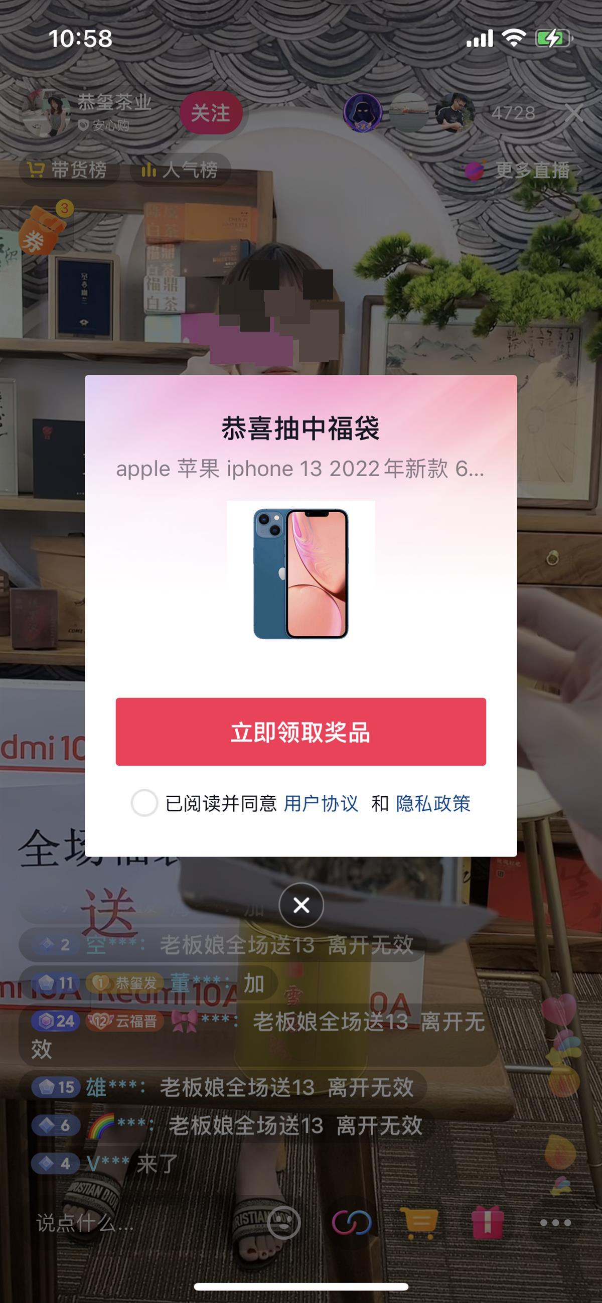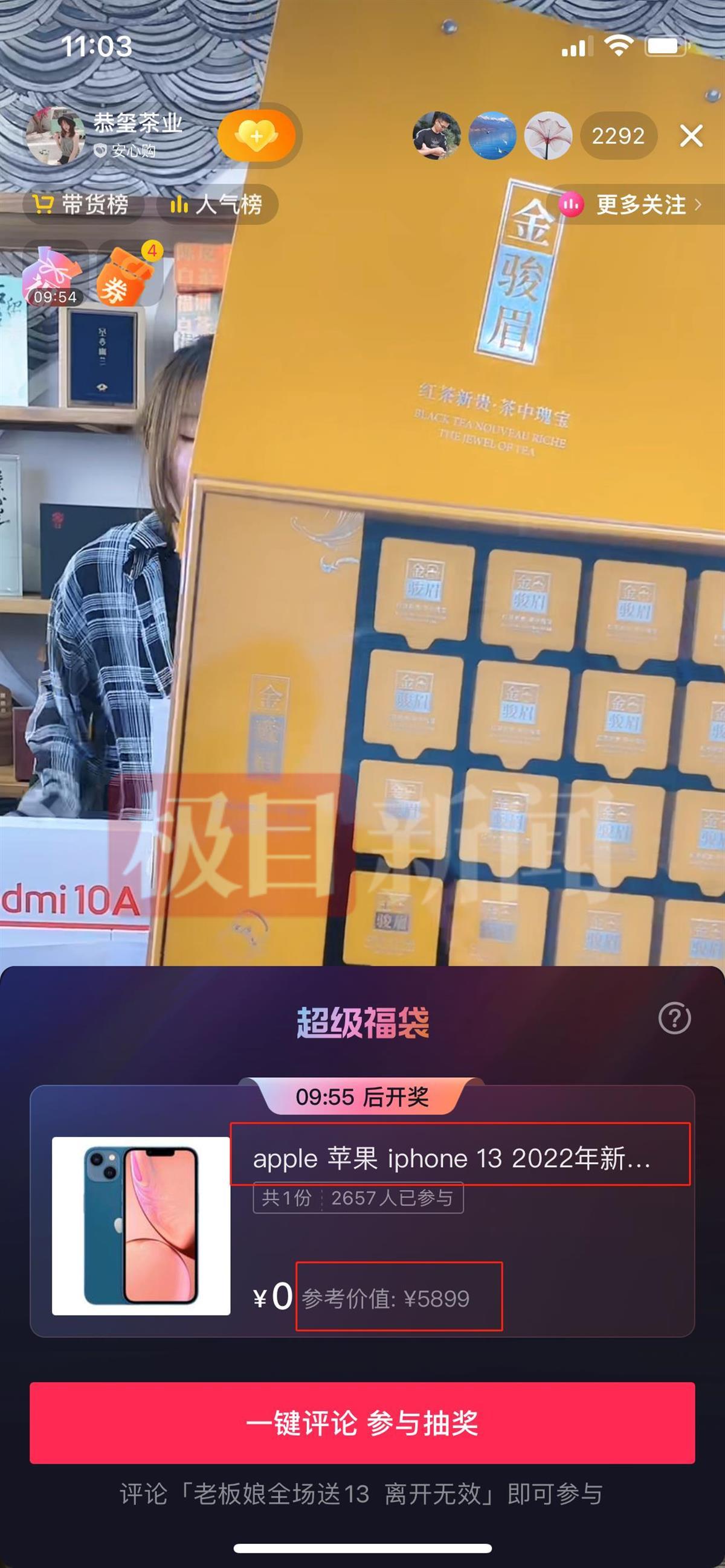 万女士介绍,29日晚,她在刷视频时,无意中点击进入了“恭玺茶业”的直播间,看到直播间里还有两分钟就要开福袋了,而且参与的人还很多,自己点击参与后,马上就中奖了。