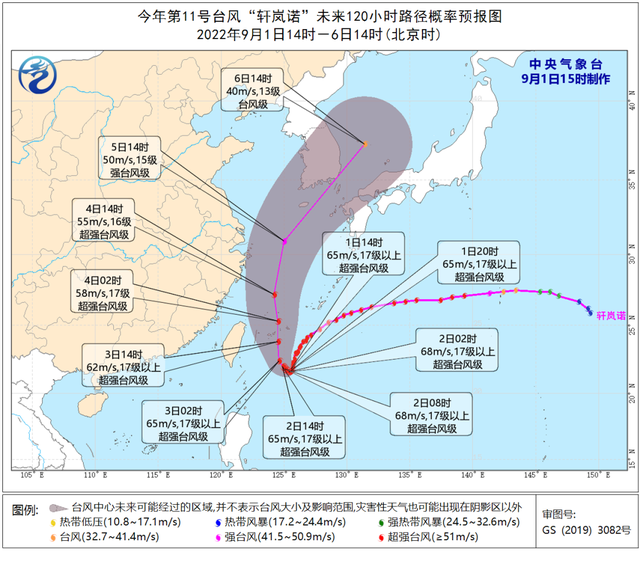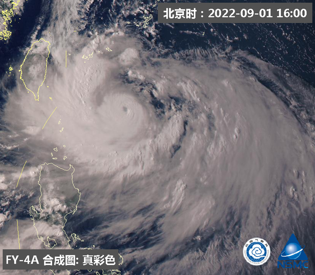 9月1日16时,“轩岚诺”的中心位于距离台湾省台东市东偏南方向约475公里的洋面上,中心附近最大风力达17级以上(65米/秒,超强台风级),中心最低气压为910百帕。