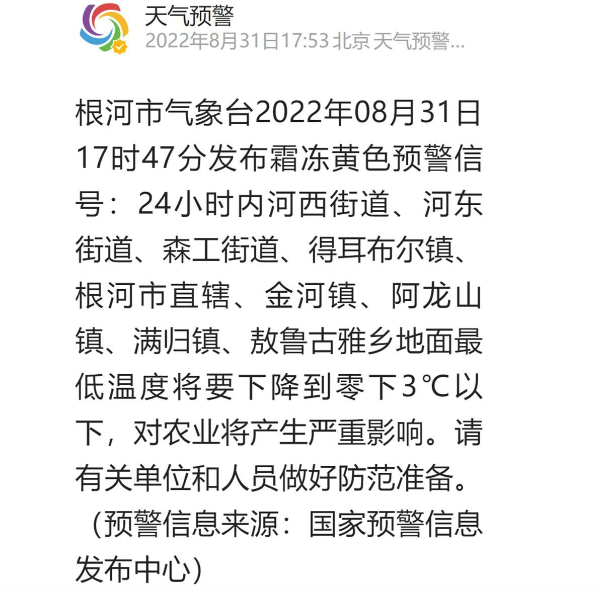 8月31日下午5时47分,内蒙古根河市气象台发布霜冻黄色预警信号,24小时内根河市直辖、金河镇、阿龙山镇、满归镇、敖鲁古雅乡等地面最低温度将要下降到零下3℃以下,对农业将产生严重影响。