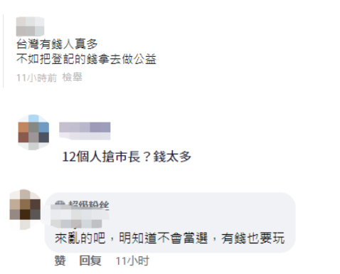 另外也有人表示,“台湾有钱人真多,不如把登记的钱拿去做公益。”“来乱的吧,明知道不会当选,有钱也要玩。” ↓