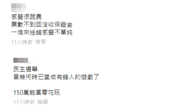 还有人称,“感觉很诡异,票数不到会没收保证金,一堆来送钱感觉不单纯。”“民主选举,曾几何时已变成有钱人的游戏了。” ↓