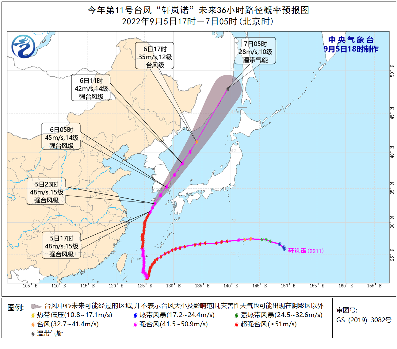 台风“轩岚诺”路径。 中央气象台9月5日18时制作