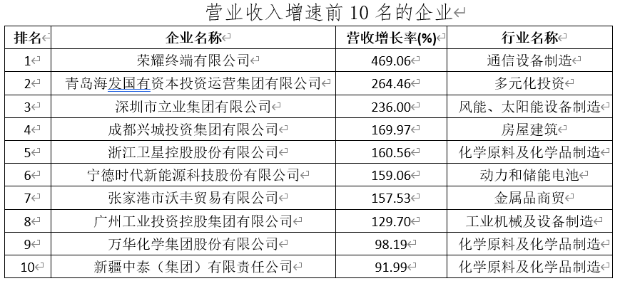 2022中国企业500强中,有8家企业的营业收入增长超过1倍以上,41家企业的营业收入增速高于50%。