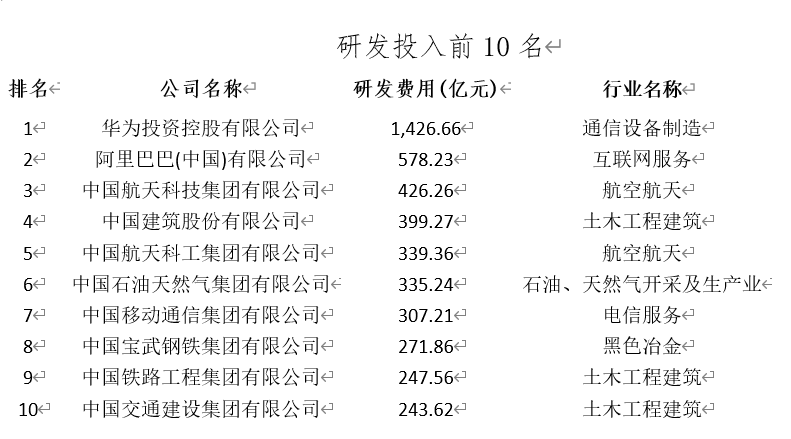 在研发上,2022中国企业500强共投入研发费用1.45万亿元,占2021年全社会研发投入的51.95%。华为研发投入1426.66亿元,名列研发投入榜单第一。