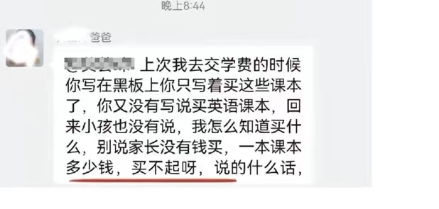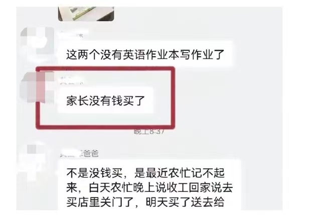 从广泛流传的截图和视频来看,名为“六(4)班家长微信群”的对话框里,有人发出了两名学生的照片,之后表示:“这两个没有英语作业本写作业了,家长没有钱买了。”随后,有家长出来回应称,“不是没钱买,是最近农忙记不起来,白天农忙,晚上收工回家说去买,店里关门了,明天买了送去给他,不好意思老师。”接着,又有回复称:“回来小孩也没有说,我怎么知道买什么,别说家长没有钱买,一本课本多少钱,买不起呀,说的什么话。”言语中,充满了气愤。
