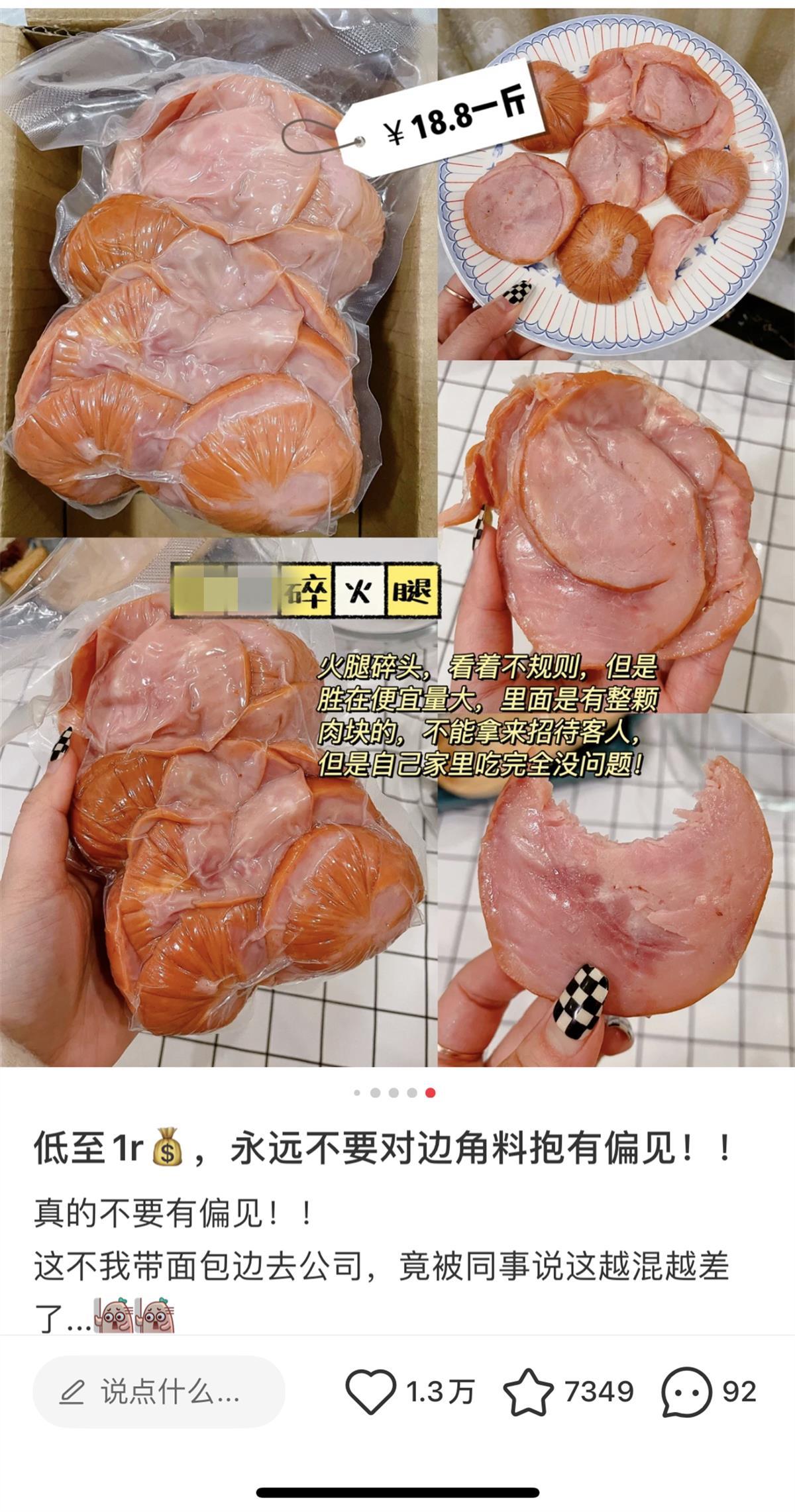 在社交平台上,也有不少网友分享了购买“边角料”商品后进行加工、烹饪的经验,比如用空气炸锅炸面包边、利用火腿碎头制作披萨等。