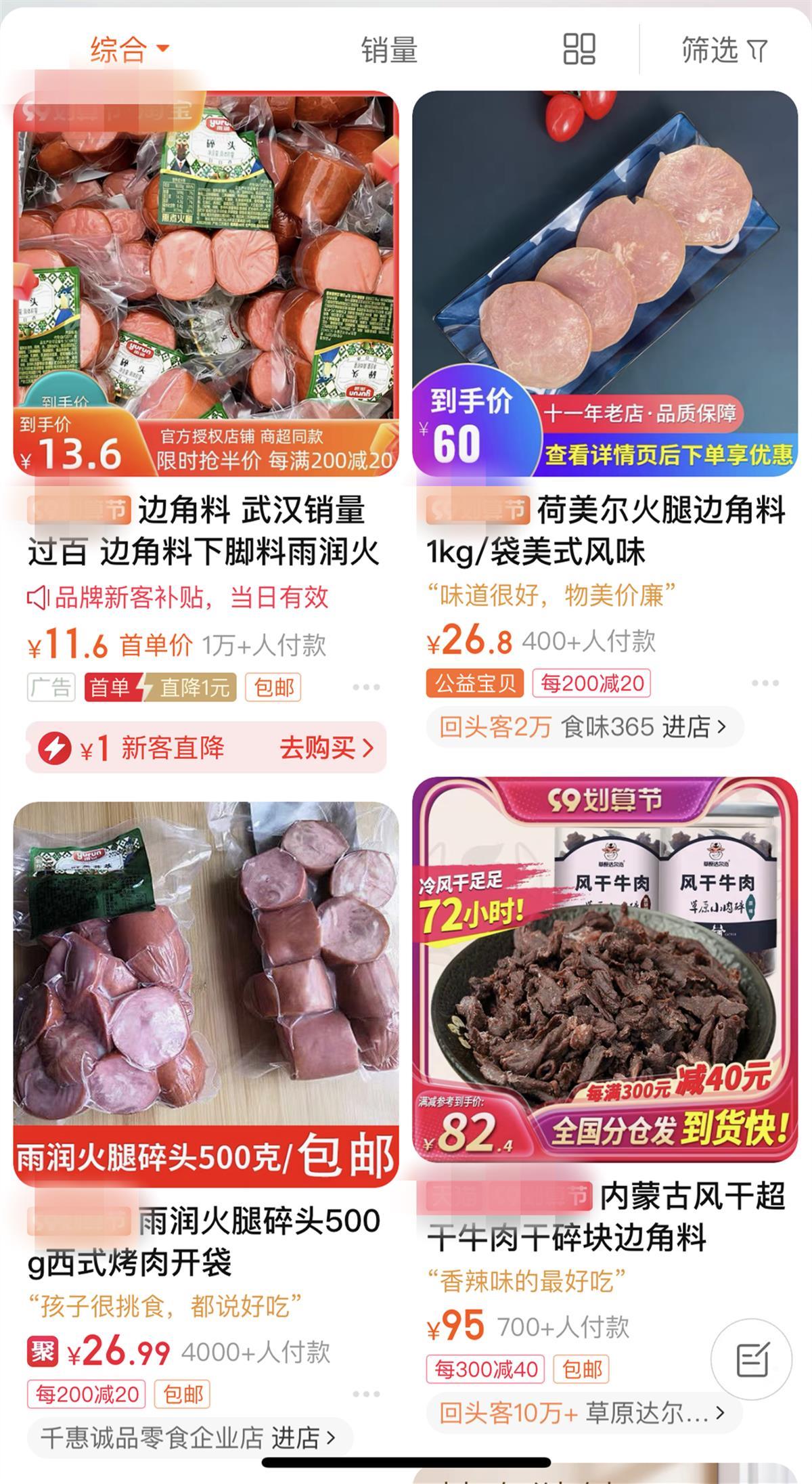 在电商平台上,极目新闻记者搜索“边角料”,有猪肉脯碎、牛肉干、火腿碎、蛋糕边、饼干碎等多种商品。一家售卖猪肉脯碎的店铺,500克的碎片售价28.8元,月销量超过了4000笔。在评价页面,有消费者表示:味道不错,比买正装划算。但也有消费者表示,碎片很薄,吃起来很硬,口感像淀粉。