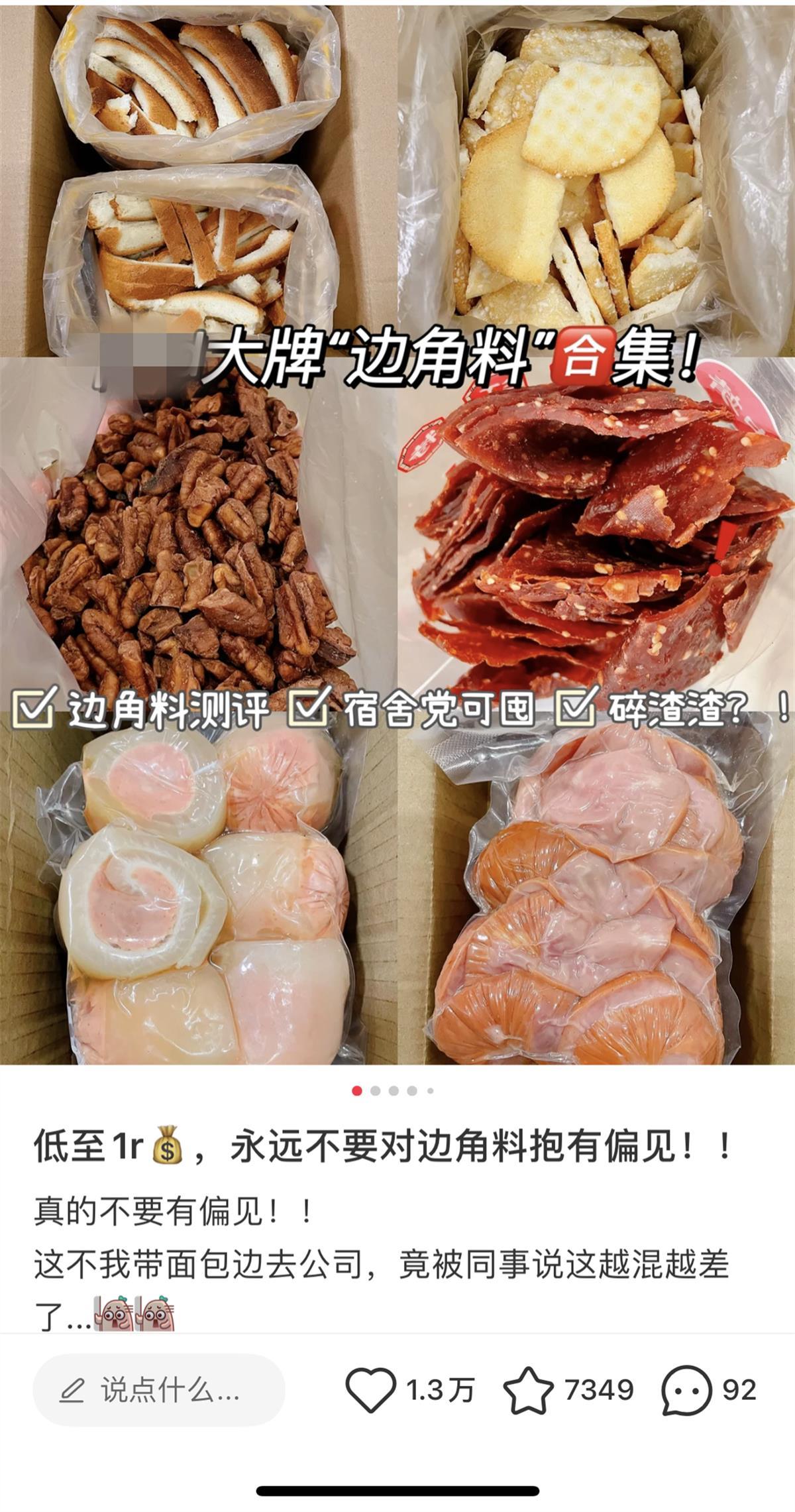 最近,90后市民孙琦在社交平台上看到不少零食边角料的安利帖,她也试着在电商平台下单了一包猪肉脯碎,价格确实比原品牌低一些,“味道和价格都还可以,但是碎片是否是原品牌流出就不得而知了。”
