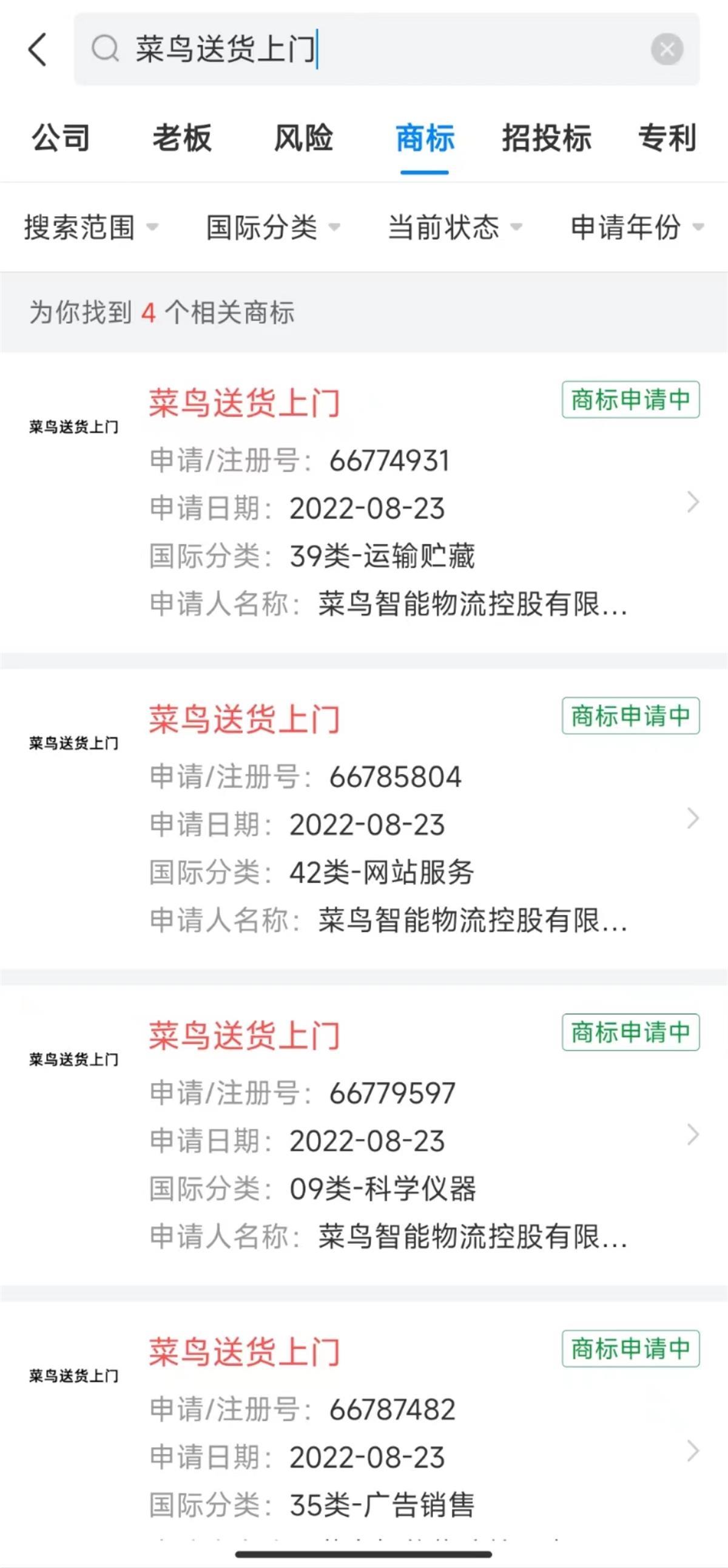 据天眼查APP显示,菜鸟已于8月23日申请注册“菜鸟送货上门”商标,国际分类包含39类运输贮藏、42类设计研究等,商标状态为注册申请中。