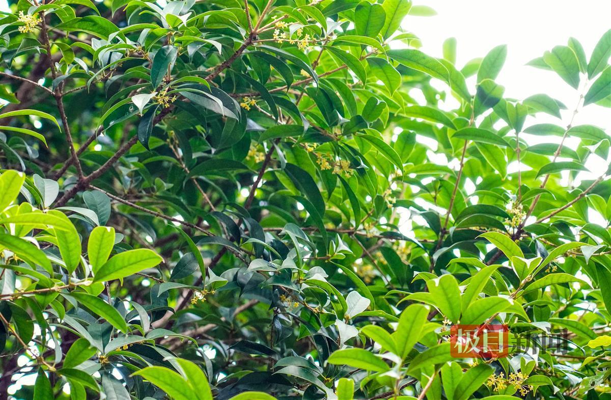 记者在珞喻路吴家湾附近看到,道路两侧有数十棵桂花树,只有6棵桂花树开花了,目前只是初开,所以还没到一树繁花的状态。