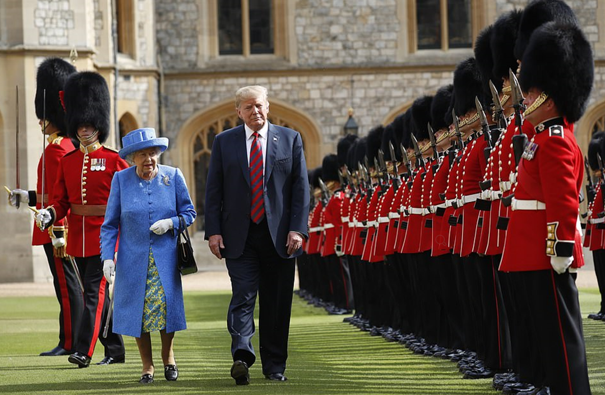 2018年7月,英国女王伊丽莎白二世和时任美国总统特朗普在温莎城堡检阅仪仗队