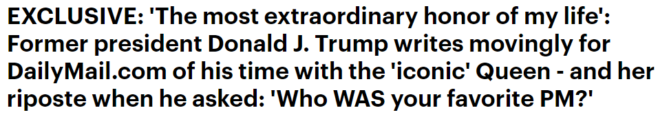 英国《独立报》也报道了特朗普为《每日邮报》撰文的事。报道说,特朗普在文章开头就伊丽莎白二世去世表示了哀悼,随后追忆起自己曾出访英国、与英女王多次会面的经历。特朗普表示,“和女王陛下共度时光是自己一生中最非凡的荣誉之一”。