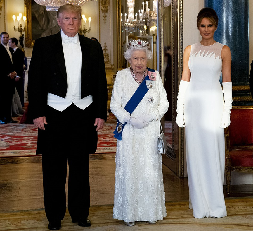 2019年6月,伦敦白金汉宫,特朗普与妻子梅拉尼娅与英国女王伊丽莎白二世合影