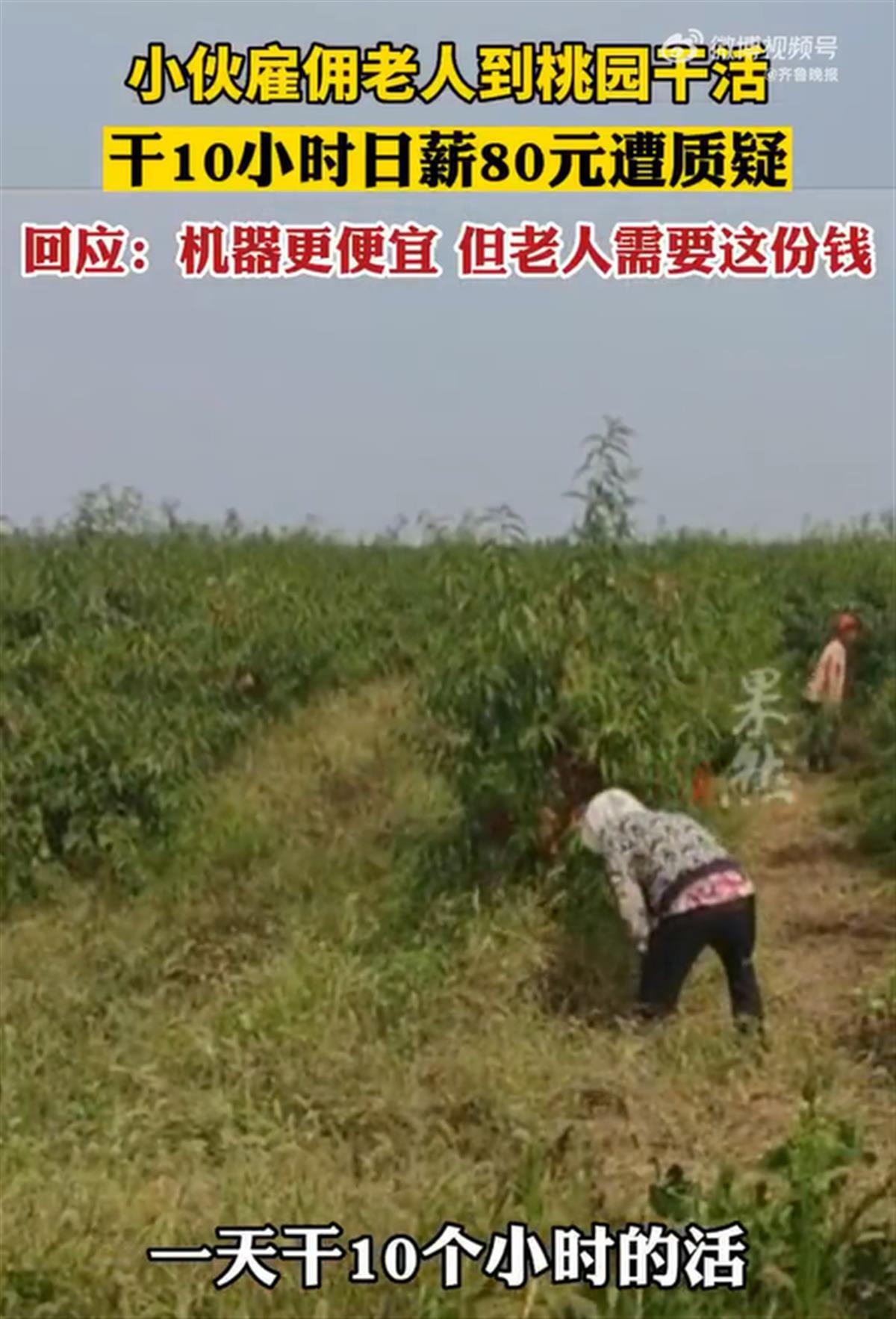 对此,马剑回应称:“一天干10小时的活80元,当地只有这个工钱行情,不坑人。”他说,本可以用机器干活,更省钱,效率也更高,但来桃园工作的老人家里条件都不宽裕,需要赚钱来贴补家用,有一位67岁的老人,孙女刚上大学,儿子工资不够花,老人挣到钱后,就赶紧打给儿子补贴家用……