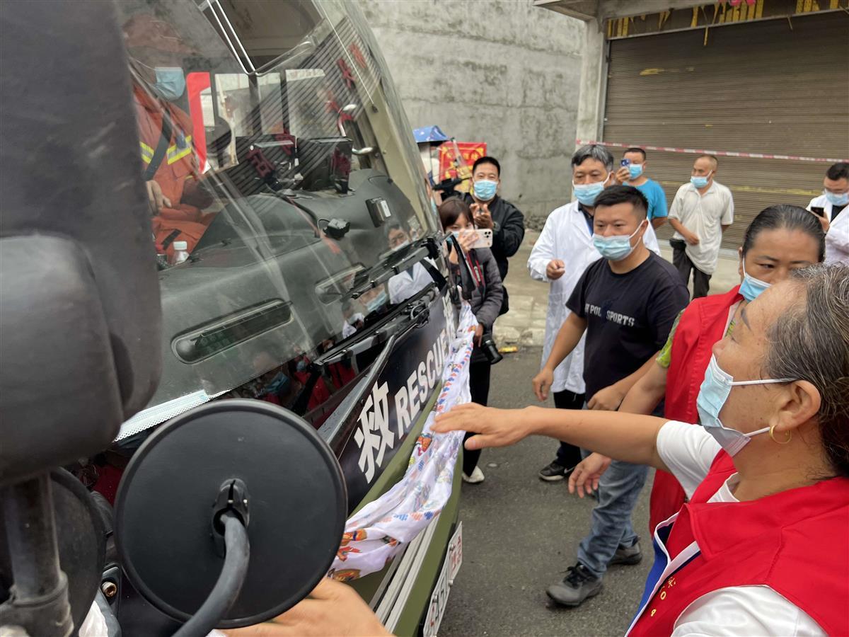 现场视频中,有一位群众往汽车中“投喂”一袋吃的,救援人员丢回后,市民又再次丢上车,如此丢了五次也没能送上车。车队缓慢前行,沿途不断有居民在车辆上系上洁白的哈达。