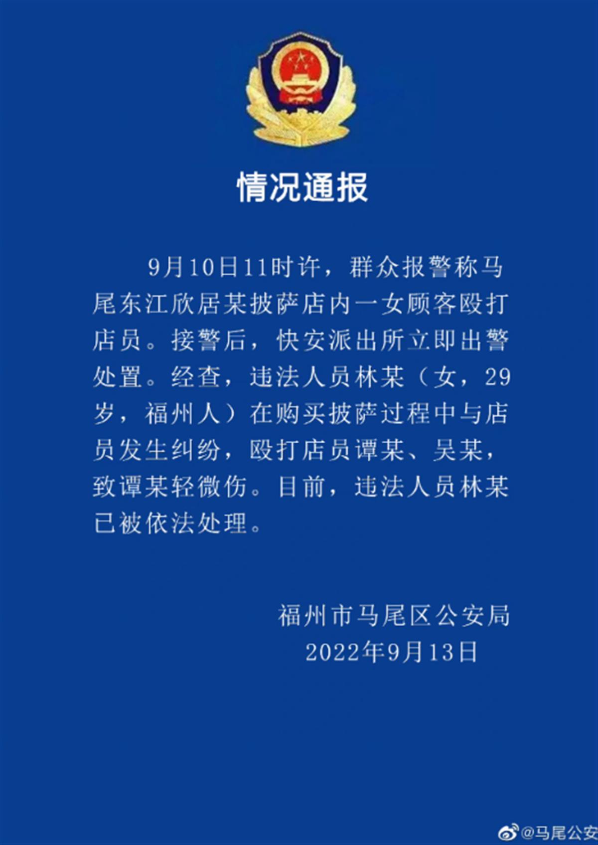 9月13日晚,福州市马尾区公安局发布情况通报称,9月10日11时许,群众报警称马尾东江欣居某披萨店内一女顾客殴打店员。接警后,快安派出所立即出警处置。经查,违法人员林某(女,29岁,福州人)在购买披萨过程中与店员发生纠纷,殴打店员谭某、吴某,致谭某轻微伤。目前,违法人员林某已被依法处理。